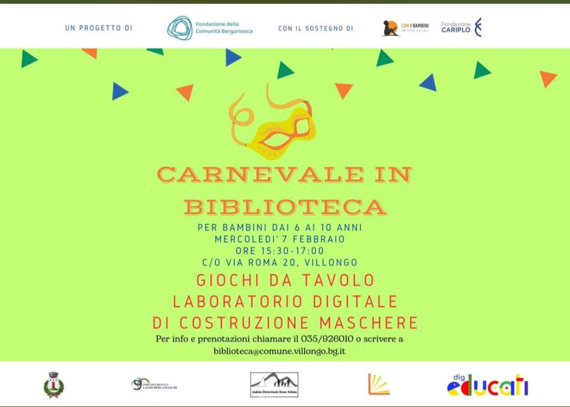 Mercoledรฌ 7 febbraio, dalle 15:30 alle 17:00, si festeggerร il Carnevale presso la Biblioteca di Villongo.