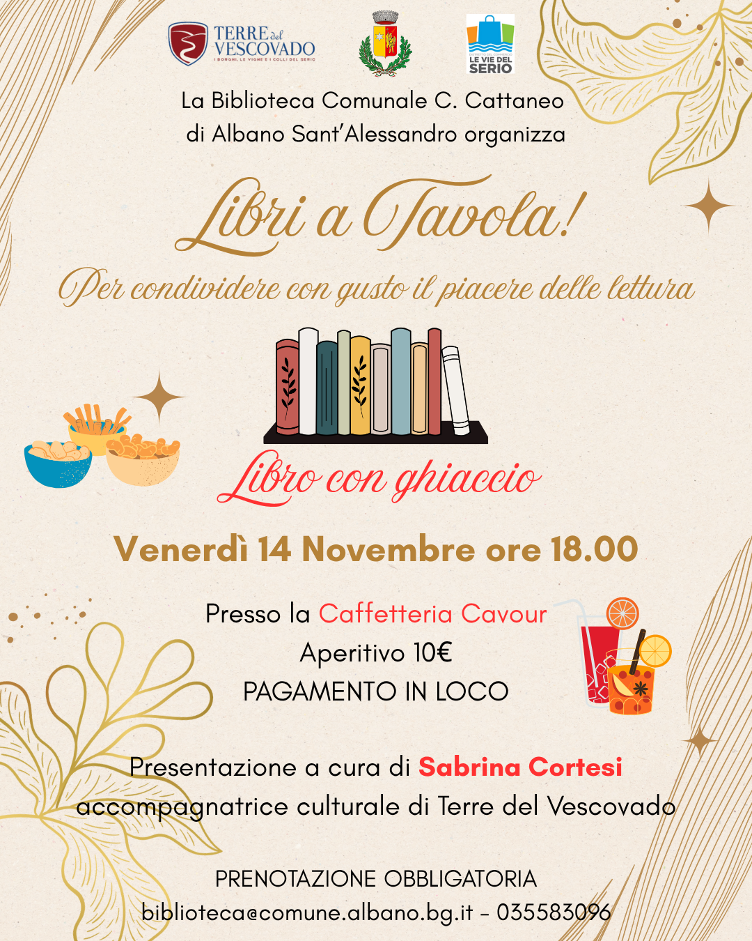 La Biblioteca Comunale Cattaneo di Albano Sant’Alessandro, in collaborazione con Terre del Vescovado, invita a un nuovo appuntamento della rassegna «Libri a Tavola!», pensata per unire il piacere della lettura a quello della convivialità.