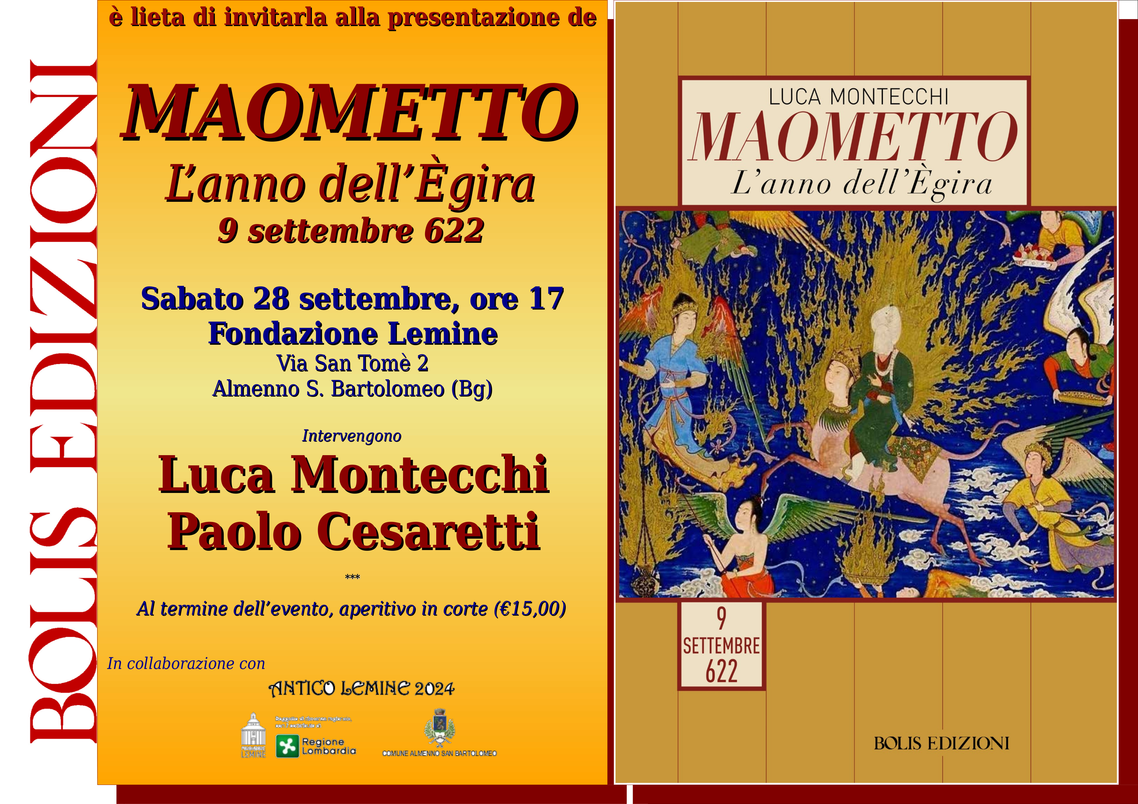 Maometto. L'anno dell'Egira: un viaggio nel cuore dell'Islam. Siete invitati a un evento imperdibile dedicato alla storia e alla cultura islamica. Sabato 28 settembre, alle ore 17:00, presso la Fondazione Lemine ad Almenno San Bartolomeo (Bg), si terrà la presentazione del libro "Maometto. L'anno dell'Egira" di Luca Montecchi.