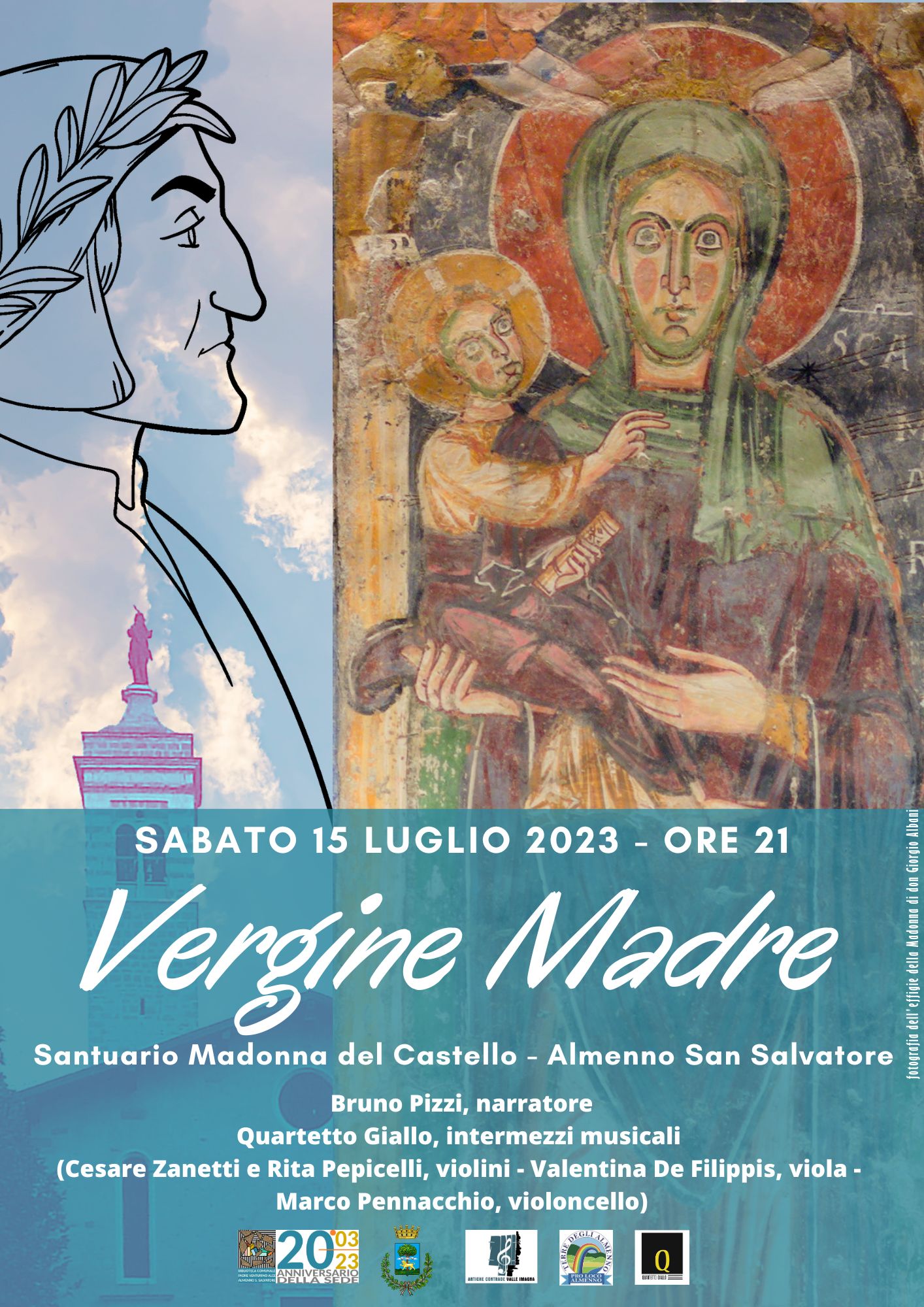 Bruno Pizzi ci racconterà di tutte le apparizioni di Maria nel capolavoro di Dante, dal profondo Inferno fino al celeberrimo ultimo canto del paradiso, con flash back e colpi di scena, che alternano solennità drammatica a giocosa commedia. Gli intermezzi musicali di genere classico saranno a cura del Quartetto Giallo.