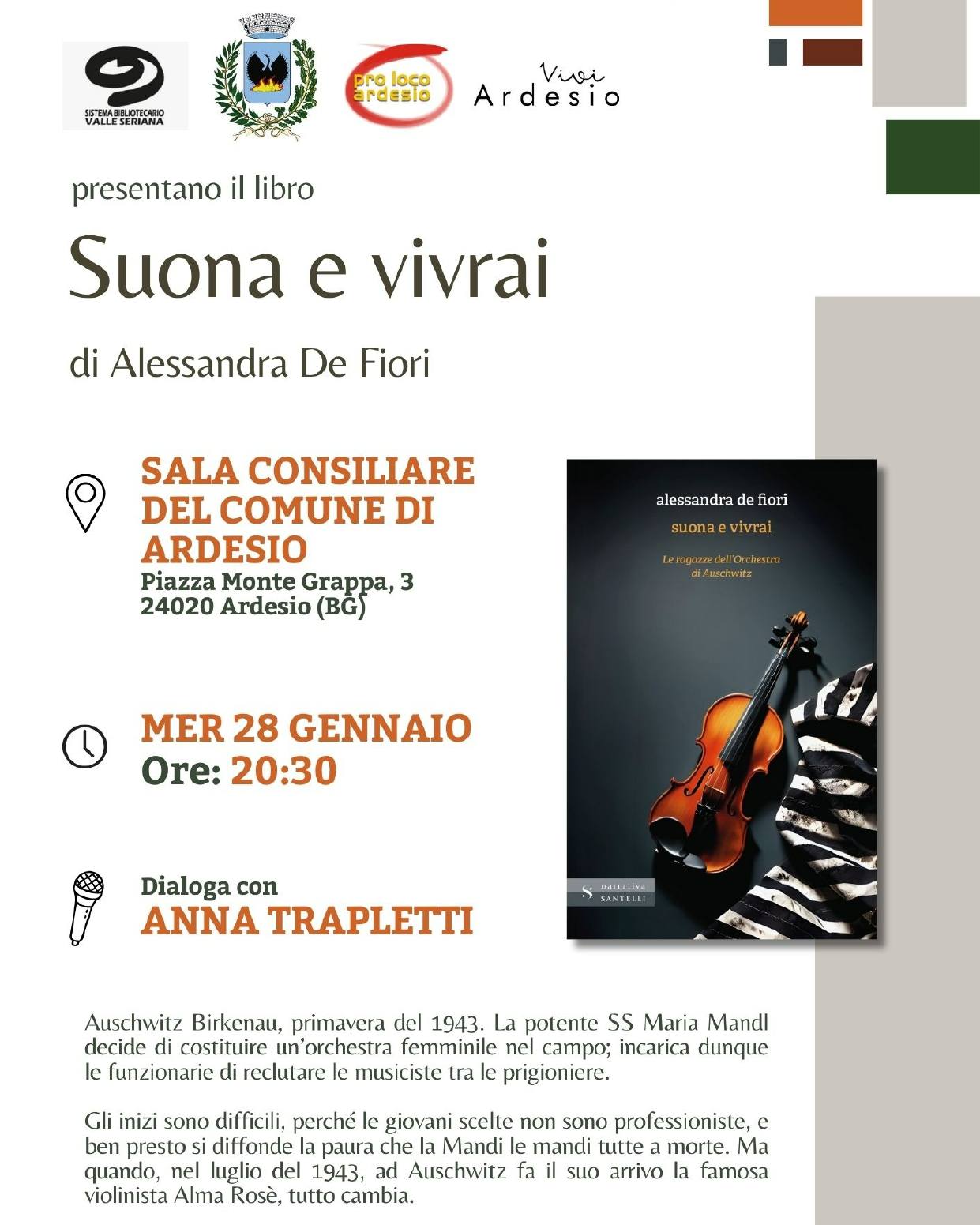 In occasione della Giornata della Memoria, alla Sala Consiliare del Comune di Ardesio è in programma la presentazione del libro di Alessandra De Fiori, che racconta la storia delle ragazze dell'Orchestra di Auschwitz.