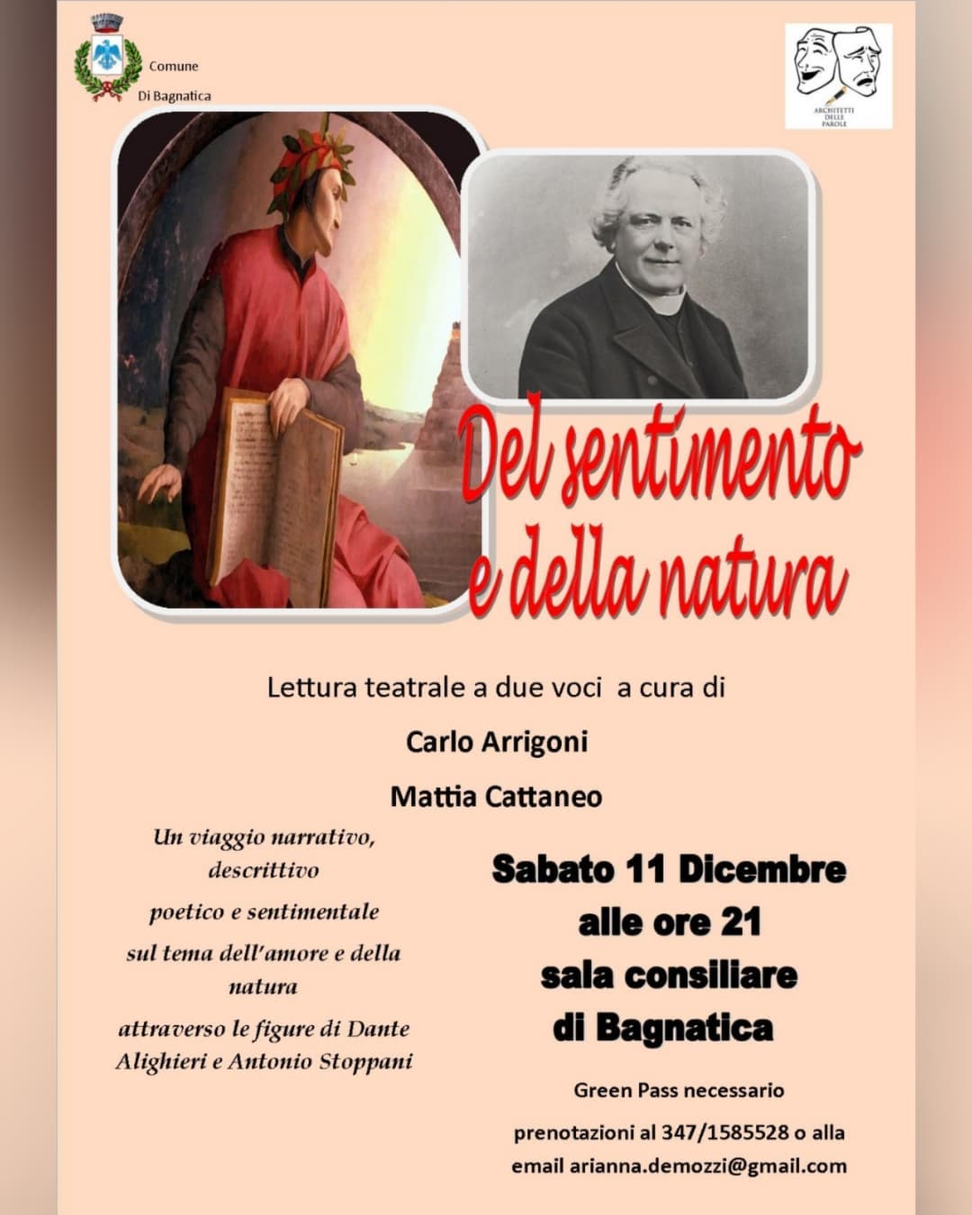 L’amministrazione comunale è lieta di invitare la cittadinanza all’evento “Del Sentimento e della natura”, una lettura teatrale in ricordo di Dante Alighieri ( a 700 anni dalla morte) e di Antonio Stoppani (a 130 anni dalla morte). Carlo Arrigoni e Mattia Cattaneo con la loro lettura teatrale ci guideranno in un viaggio narrativo, descrittivo poetico e sentimentale sul tema dell’amore e della natura.