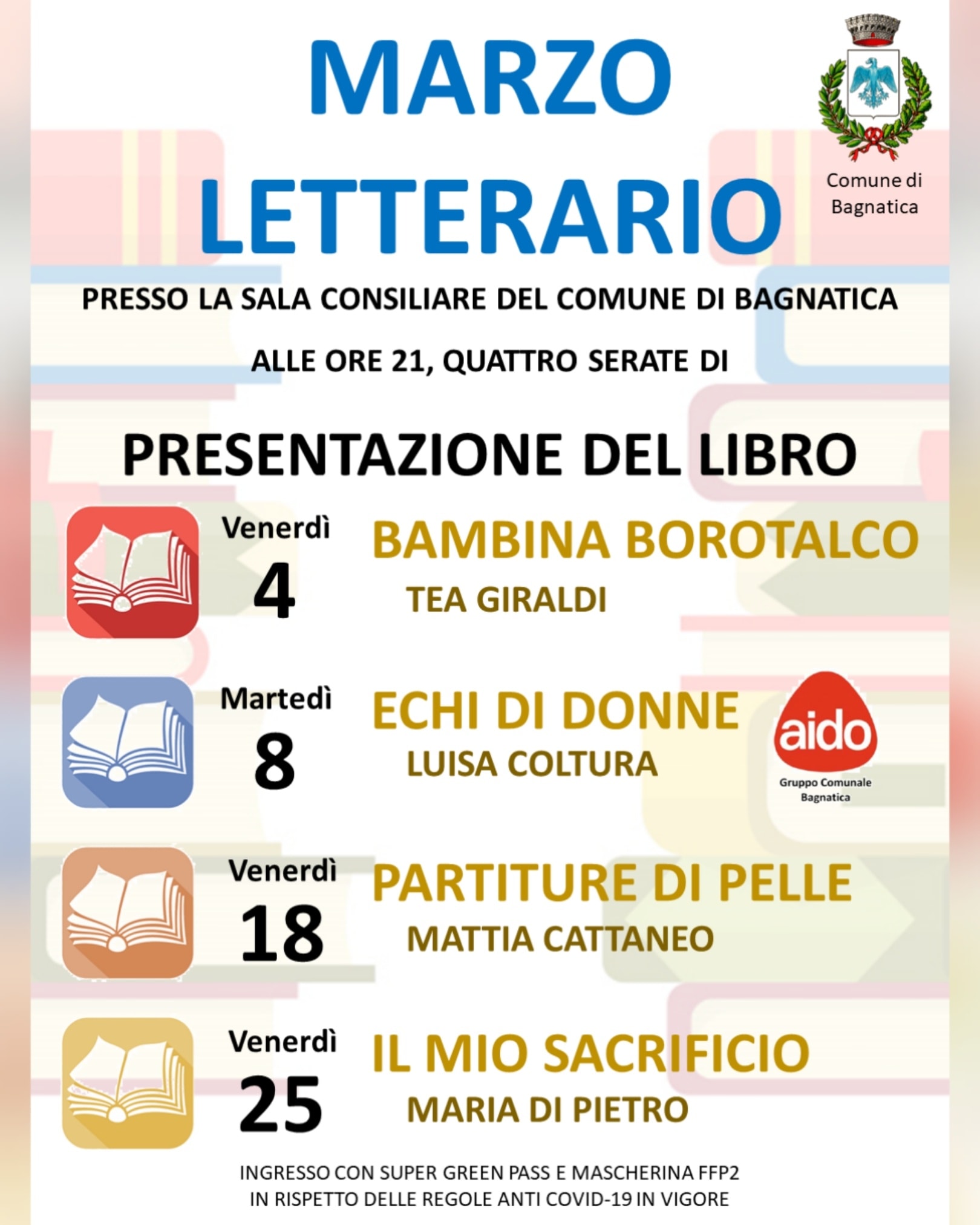 Durante il mese di Marzo, la sala consiliare del comune di Bagnatica ospiterà 4 serate in cui gli autori presenteranno i loro libri.