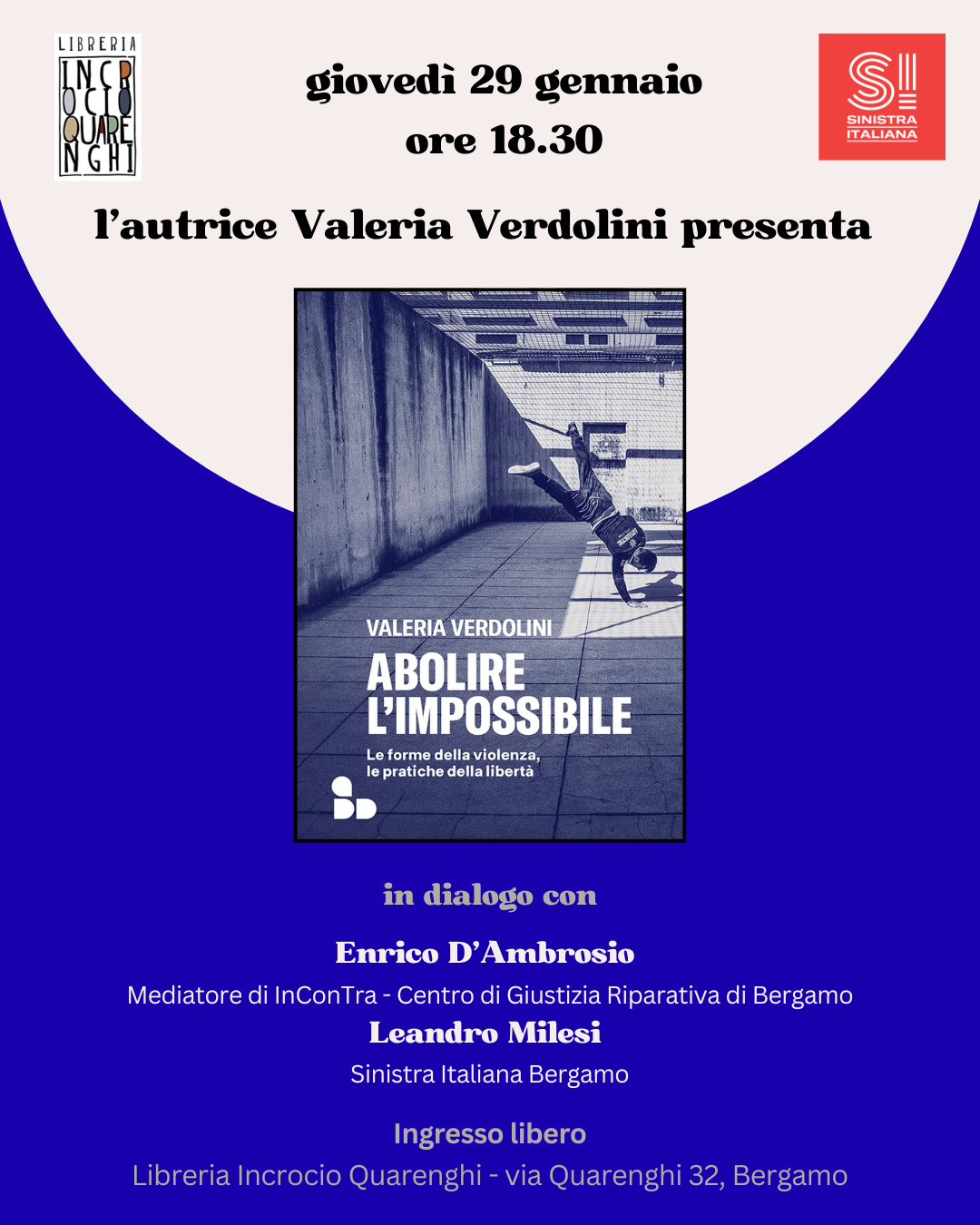 Dialogano con l'autrice Enrico D'Ambrosio, mediatore di InConTra - Centro di Giustizia Riparativa di Bergamo, e Leandro Milesi, Sinistra Italiana Bergamo. L'evento è organizzato in collaborazione con Sinistra Italiana Bergamo.