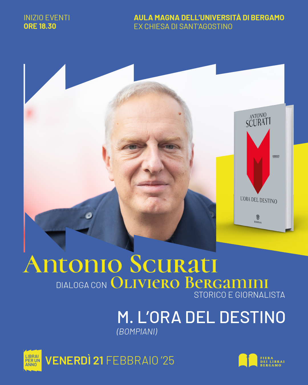 Prosegue la nuova rassegna letteraria "Librai per un anno" che promuove l'azione dei librai indipendenti di Bergamo, durante tutto l'anno: appuntamento con Antonio Scurati e il suo libro "M. L'ora del destino".