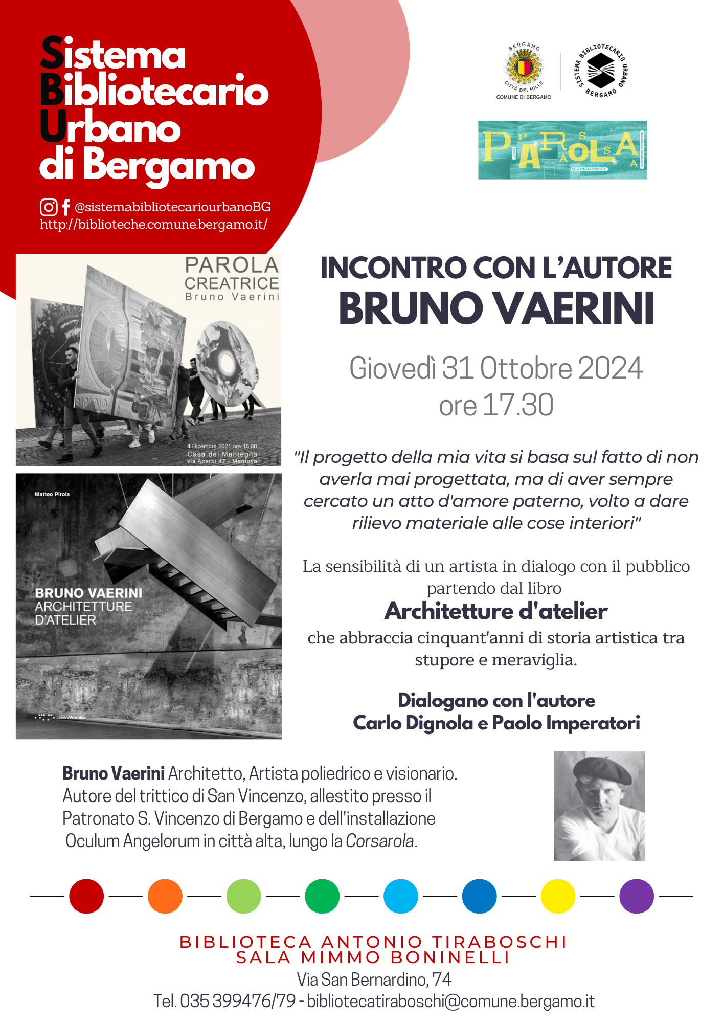 Evento da non perdere per gli appassionati di libri: incontro con l'autore Bruno Vaerini. La sensibilità in dialogo con il pubblico partendo dal libro Architetture d'atelier che abbraccia cinquant'anni di storia artistica tra stupore e meraviglia.