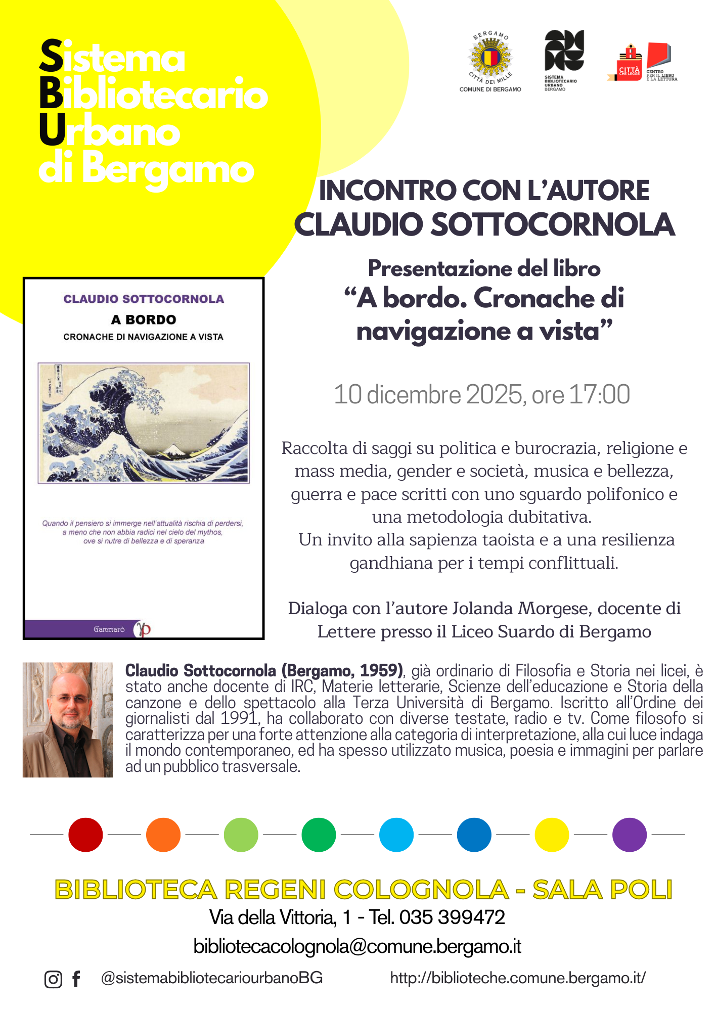 Incontro con l’autore e presentazione del libro «A bordo. Cronache di navigazione a vista», una raccolta di saggi su politica e burocrazia, religione e mass media, musica e bellezza, guerra e pace scritti con uno sguardo polifonico.