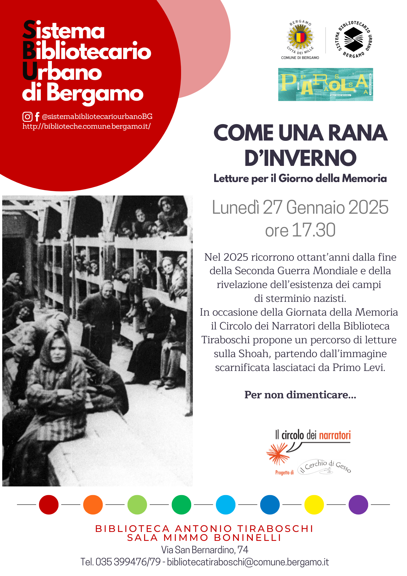 In occasione del Giorno della Memoria, il “Circolo dei Narratori” darà vita alle parole di uomini e donne sopravvissuti ad Auschwitz attraverso brani e poesie.