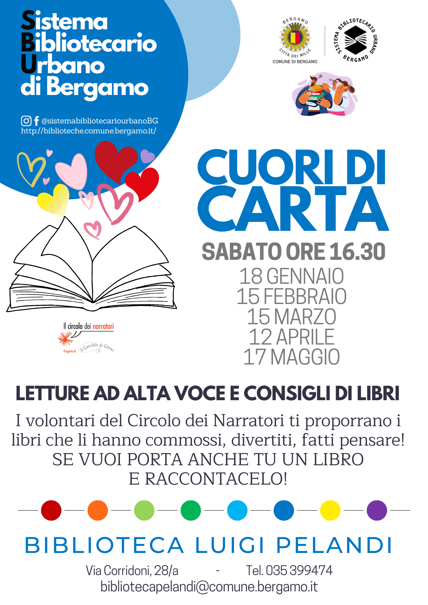 Un libro può colpirci in molti modi: emozionandoci, facendoci riflettere, dandoci chiavi per interpretare il presente... Ognuno di noi ha uno o più libri che in qualche modo ci hanno ispirato e cambiato. E allora perché non condividerlo con altri? I volontari del Circolo dei Narratori vi racconteranno cosa li ha colpiti in un libro e ve ne leggeranno alcuni passi. E se anche voi vorrete portare il vostro libro del cuore e proporlo agli altri siete i benvenuti!