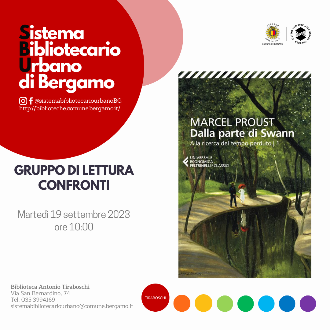 l Gruppo di Lettura Confronti discuterà di "Dalla parte di Swann" di Marcel Proust.Un morso a un piccolo dolce soffice, e ad anni di distanza rivivono le impressioni che, durante le vacanze estive nel villaggio di Combray, avevano colpito la fervida immaginazione di un ragazzo. Le letture, i tratti più buffi e coloriti della gente incontrata, l’indagine sui palpiti che animano il suo cuore. E le passeggiate lungo i due sentieri che si dipartono dal giardino di casa: quello dei Guermantes, che passa accanto alla casa dei nobili del paese, ammantati di un alone da leggenda cavalleresca, e quello dalla parte di Swann che, come il raffinato amico di famiglia da cui prende il nome, cela segreti e passioni. E così, da quella parte ci si può imbattere nella giovane Vinteuil con le sue torbide amicizie, o intravedere la signora Swann, con la sua bellezza conturbante e il suo equivoco passato.