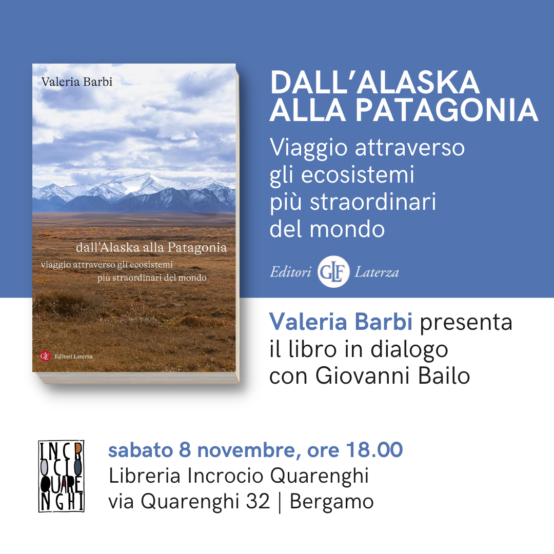 Sabato 8 novembre la Libreria Incrocio Quarenghi ospita Valeria Barbi che presenta il suo reportage «Dall'Alaska alla Patagonia. Viaggio attraverso gli ecosistemi più straordinari del mondo», recentemente uscito per Laterza. L'autrice, naturalista, politologa e giornalista, dialoga con Giovanni Bailo, agronomo e naturalista bergamasco.