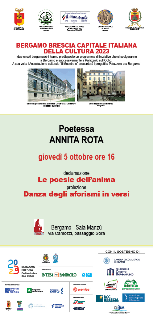 Nello spazio espositivo alla Sala Manzù, dove si può ammirare l’esposizione retrospettiva dello scultore bergamasco Piero Brolis, la poetessa Annarita Rota, illustrerà una serie di aforismi in prosa e in versi esibendo immagini che li rappresentano.