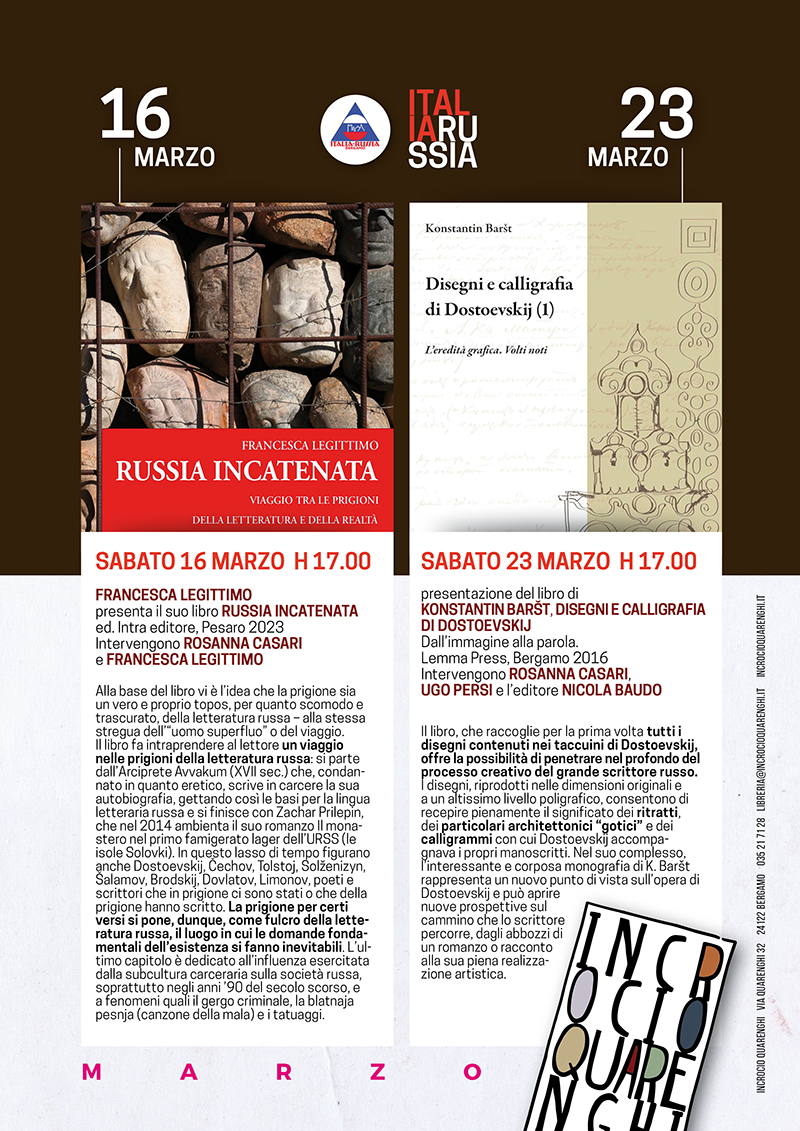 All'Incrocio Quarenghi la presentazione del libro di Konstantin Barst "Disegni e calligrafia di Dostoevskij". Un raccolta di tutti i disegni nei taccuini di Dostoevskij offrendo la possibilità di penetrare nel processo creativo dello scrittore.