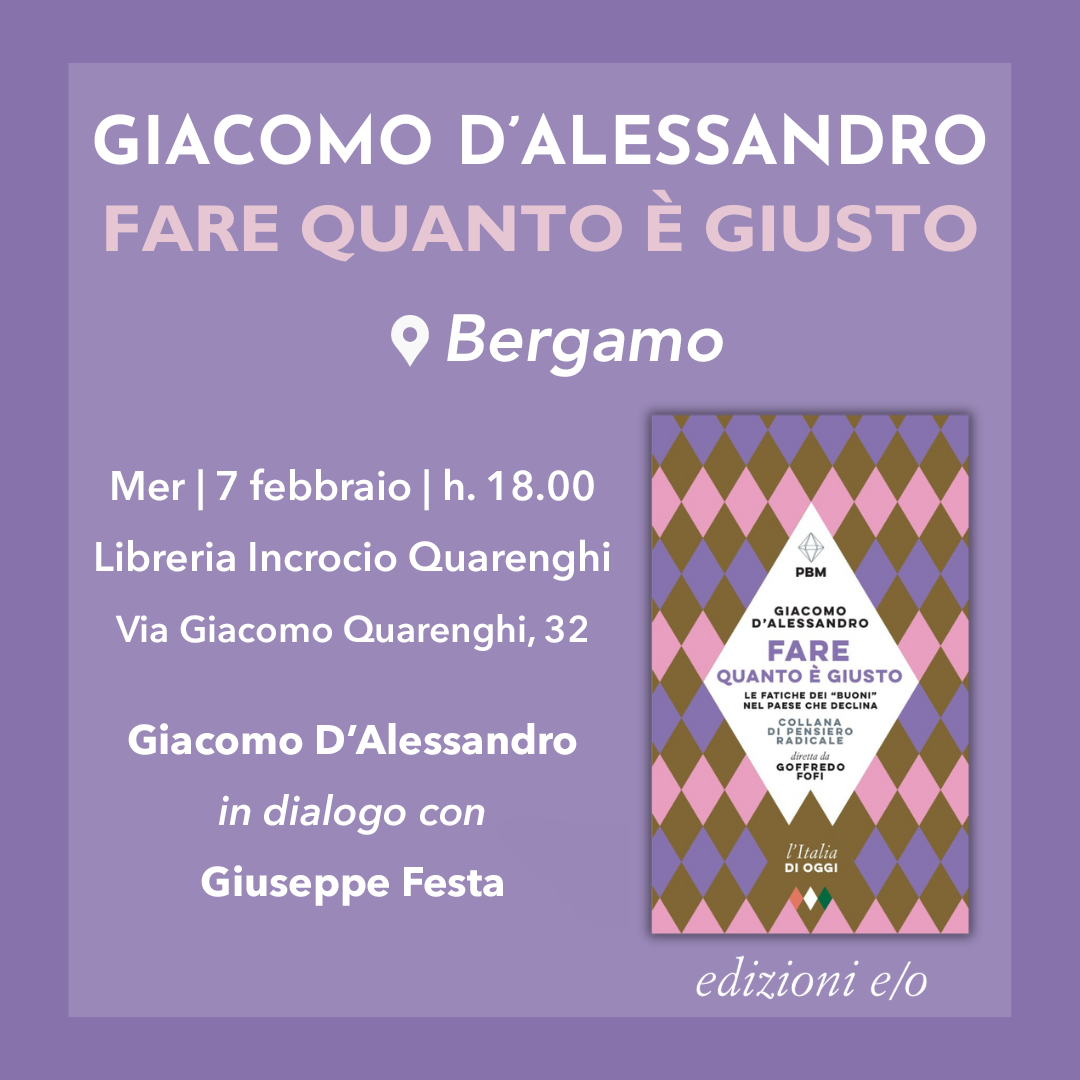 Mercoledì 7 febbraio, alle 18, Giacomo D’Alessandro presenta il suo "Fare quanto è giusto. Le fatiche dei “buoni” nel Paese che declina", edito da e/o all'interno della Collana di pensiero radicale diretta da Goffredo Fofi.
