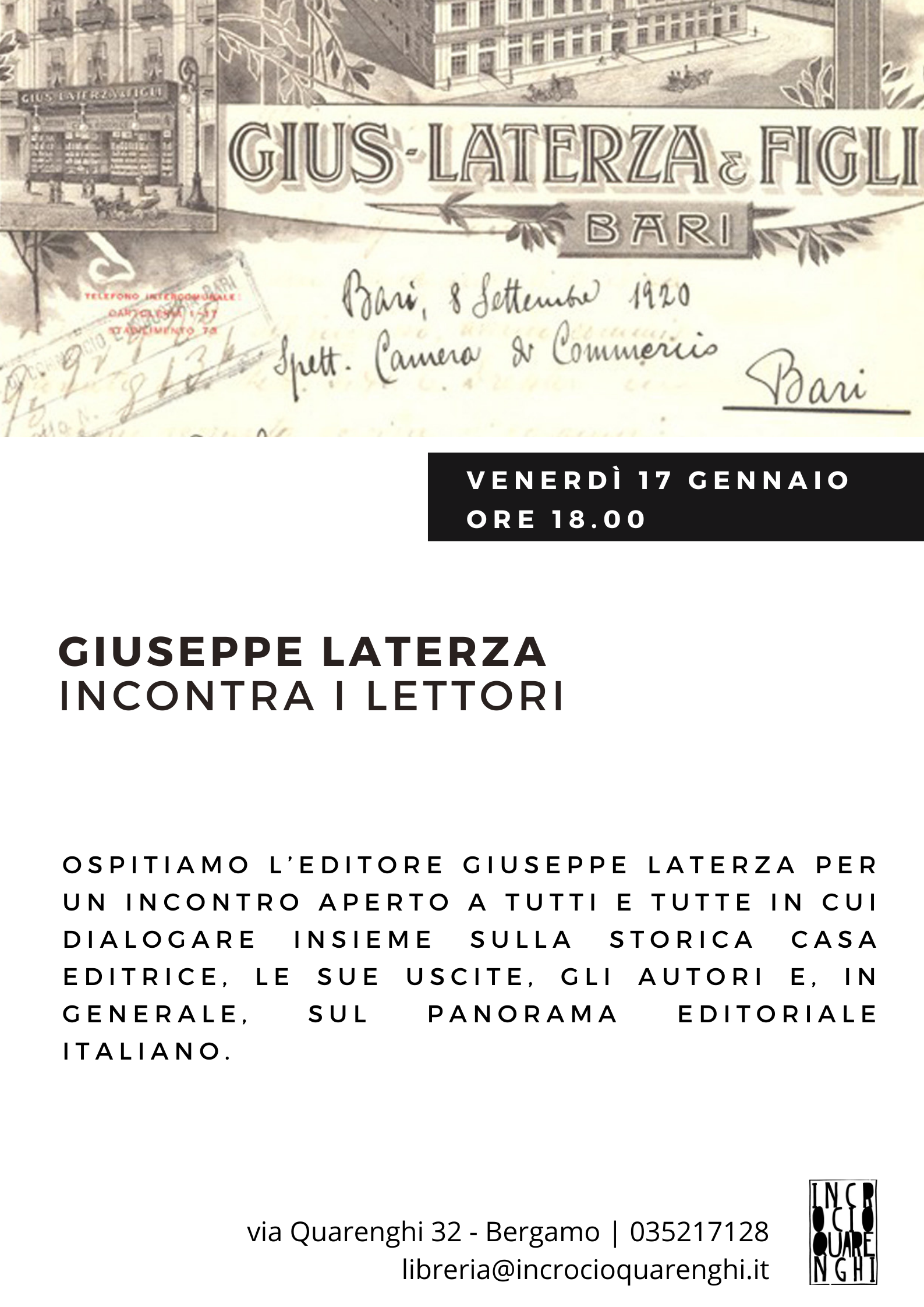 Giuseppe Laterza, editore della storica casa editrice nata a Bari nel 1901, sarà ospite alla Libreria Incrocio Quarenghi per dialogare con chi vorrà porgli domande o confrontarsi sul tema dell'editoria italiana.