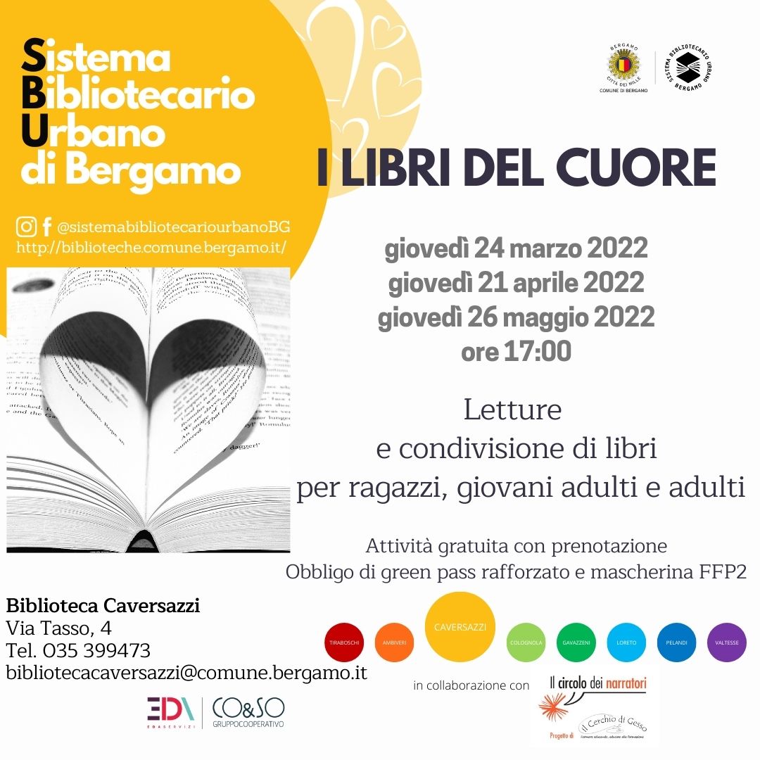 Termina, presso la Biblioteca Caversazzi di Bergamo, l'appuntamento del giovedì "I libri del cuore", nella giornata di giovedì 26 maggio: sarà un momento di letture e condivisione di libri scelti e amati dai narratori.