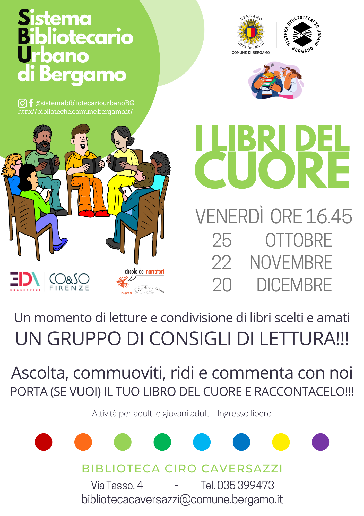 Un libro può colpirci in molti modi: emozionandoci, facendoci riflettere, dandoci chiavi per interpretare il presente... Ognuno di noi ha uno o più libri che in qualche modo ci hanno ispirato e cambiato. E allora perché non condividerlo con altri? I volontari del Circolo dei Narratori vi racconteranno cosa li ha colpiti in un libro e ve ne leggeranno alcuni passi. E se anche voi vorrete portare il vostro libro del cuore e proporlo agli altri siete i benvenuti!