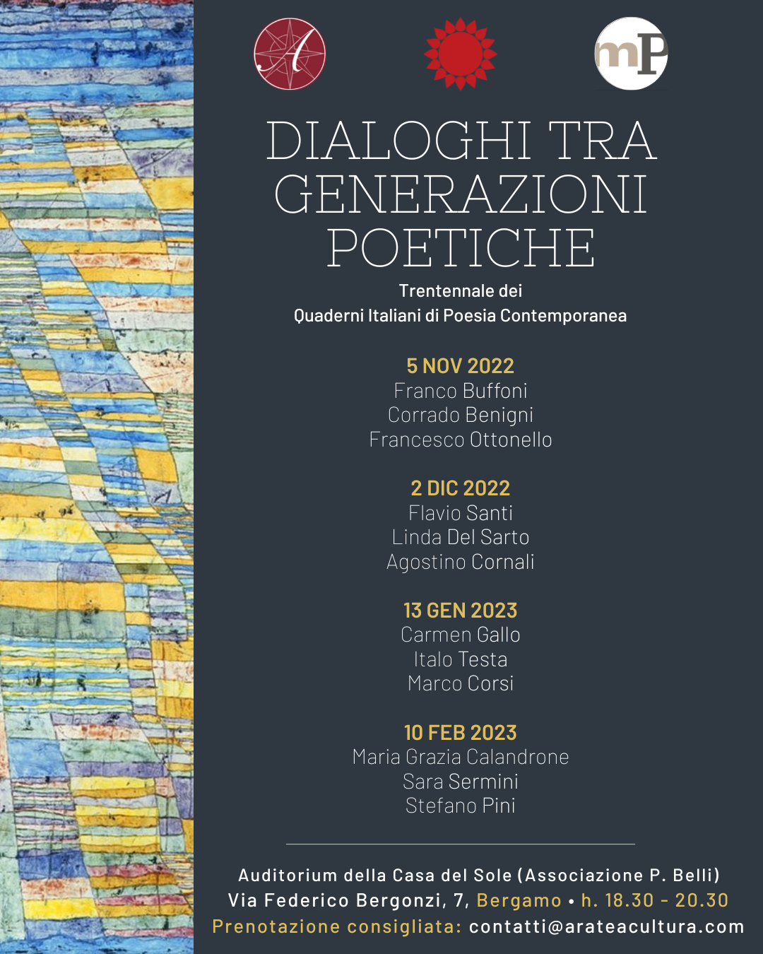 Si consiglia di prenotare un posto a questo link: https://www.arateacultura.com/dialoghi-tra-generazioni-poetiche/ .
