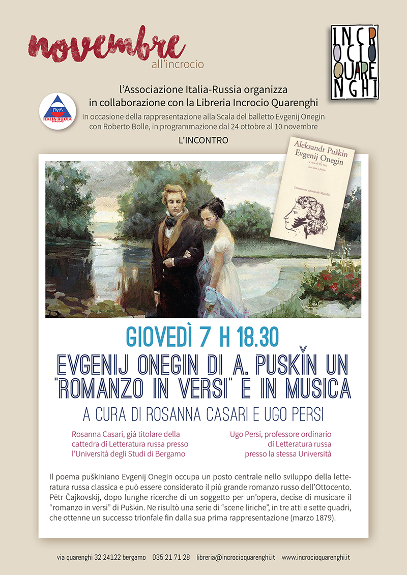 L’Associazione Italia-Russia in collaborazione con la Libreria Incrocio Quarenghi, in occasione della rappresentazione alla Scala del balletto Evgenij Onegin con Roberto Bolle, in programmazione dal 24 ottobre al 10 novembre organizza l'incontro con: Rosanna Casari, titolare della cattedra di Letteratura russa pressol’Università degli Studi di Bergamo, e Ugo Persi, professore ordinario di Letteratura russa presso la stessa Università.