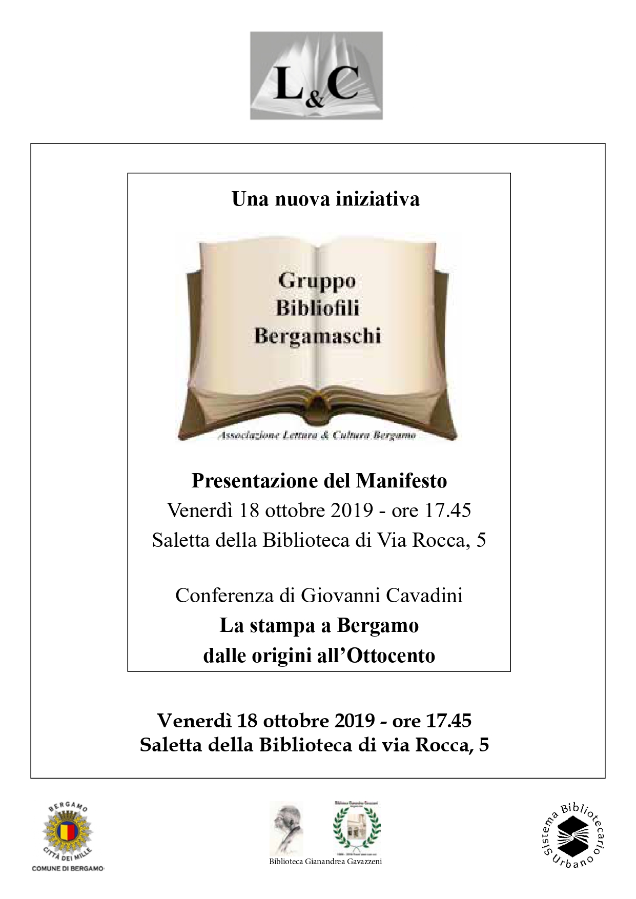 Presentazione di una nuova iniziativa dell’Associazione: Presentazione del manifesto del Gruppo Bibliofili Bergamaschi. Giovanni Cavadini, coordinatore del Gruppo, terrà una conferenza sul tema: La stampa a Bergamo dalle origini all’Ottocento