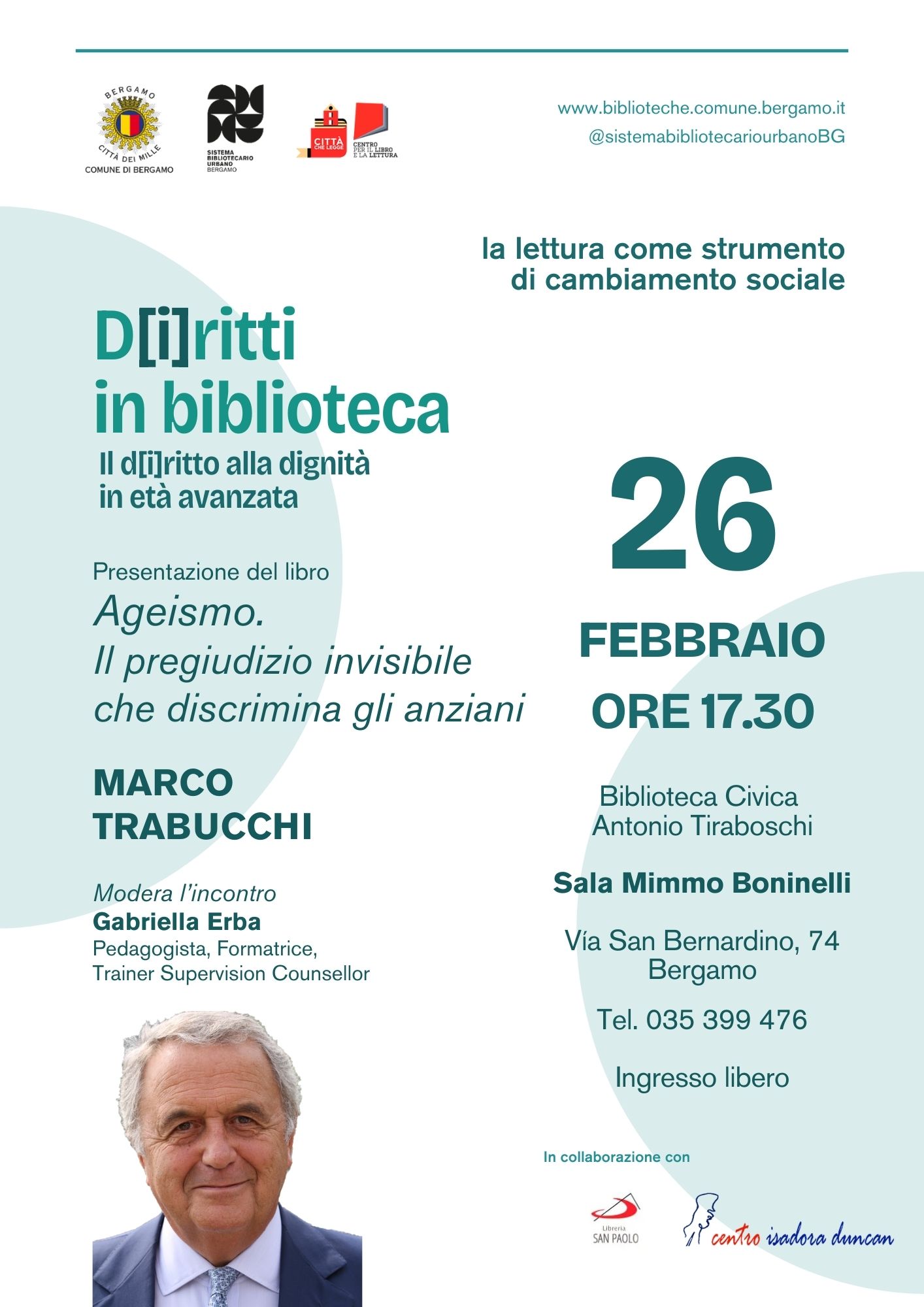 Per il ciclo di incontri «D[i]ritti in biblioteca» alla Biblioteca Tiraboschi di Bergamo, è in programma la presentazione del libro del professor Marco Trabucchi sul tema dell'ageismo e sulle discriminazioni verso gli anziani.