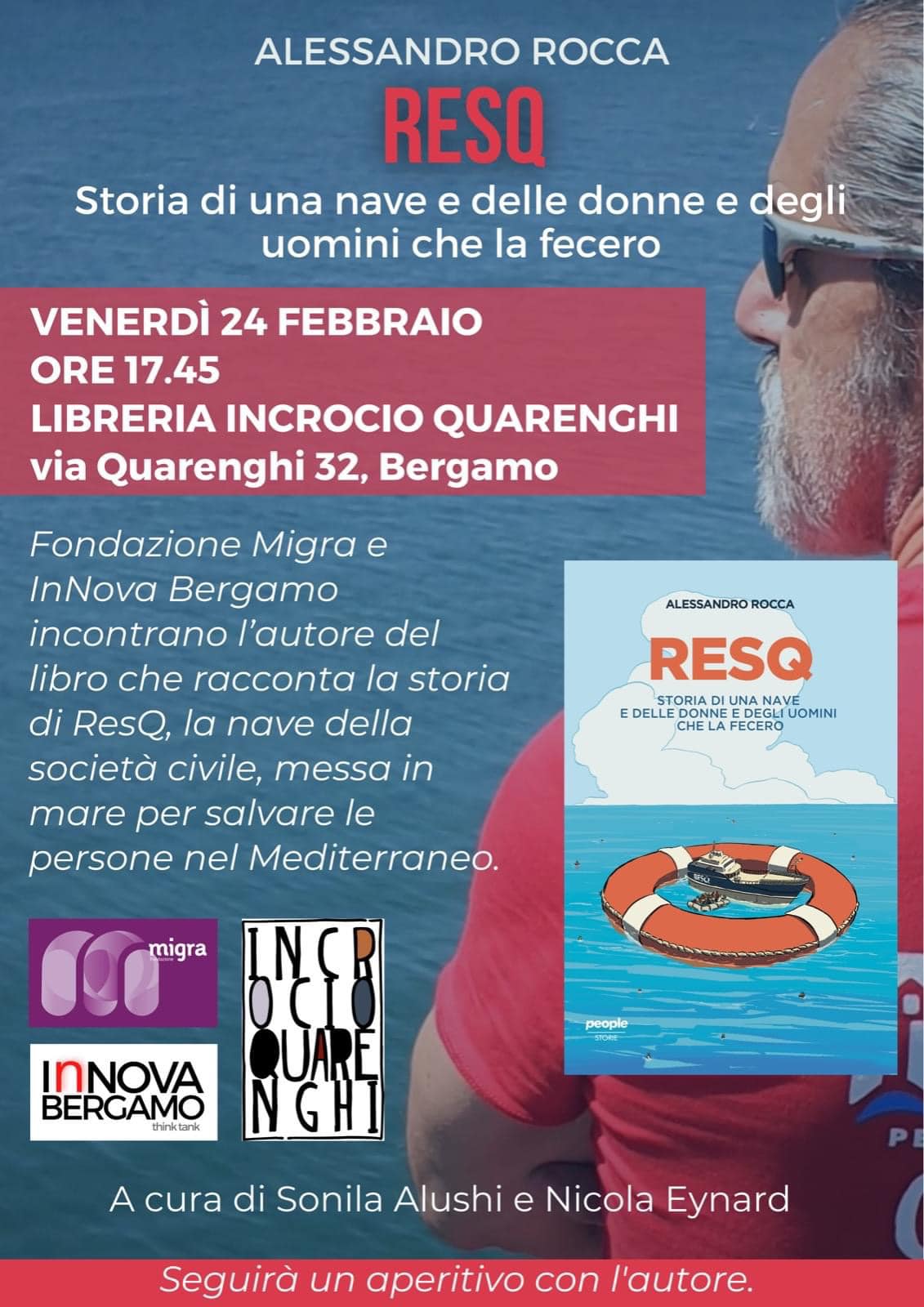 InNova Bergamo, la Fondazione Migra e la Libreria Incrocio Quarenghi vi invitano alla presentazione del libro โRESQ -Storia di una nave e delle donne e degli uomini che la feceroโ con lโautore Alessandro Rocca e il presidente di RESQ Luciano Scalettari.
