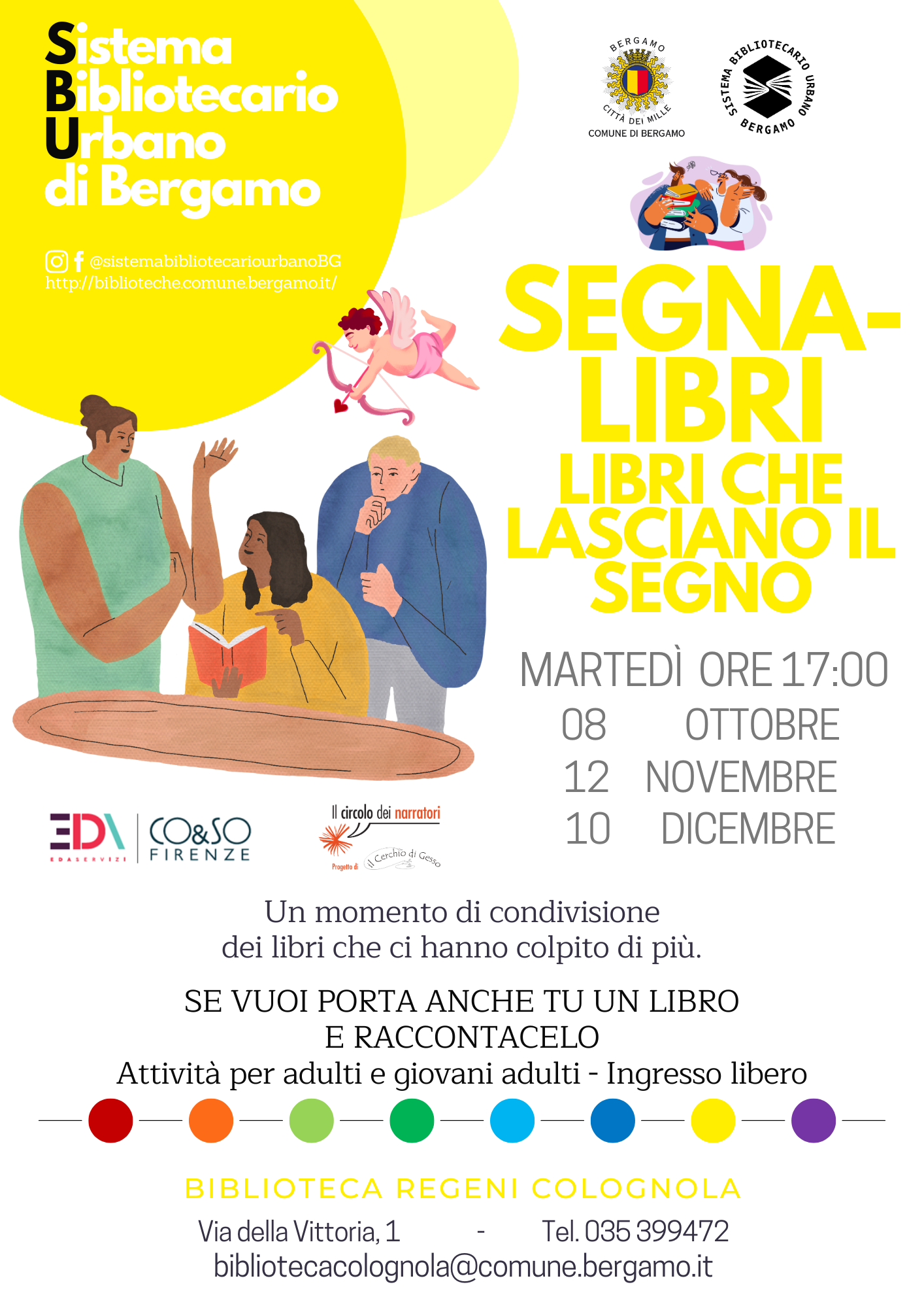 Un libro può colpirci in molti modi: emozionandoci, facendoci riflettere, dandoci chiavi per interpretare il presente... Ognuno di noi ha uno o più libri che in qualche modo ci hanno ispirato e cambiato. E allora perché non condividerlo con altri? I volontari del Circolo dei Narratori vi racconteranno cosa li ha colpiti in un libro e ve ne leggeranno alcuni passi. E se anche voi vorrete portare il vostro libro del cuore e proporlo agli altri siete i benvenuti!