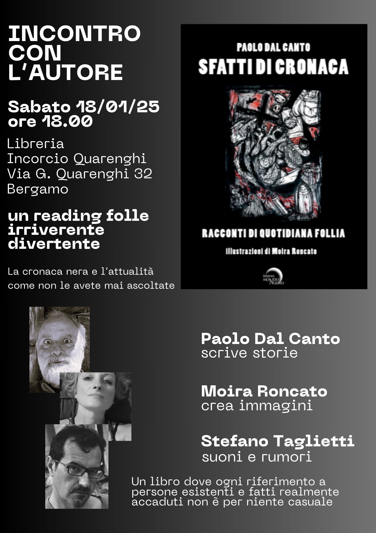 Paolo Dal Canto presente il suo libro "Sfatti di cronaca. Racconti di quotidiana follia" con un reading irriverente all'Incrocio Quarenghi, con Moira Roncato e Stefano Taglietti.