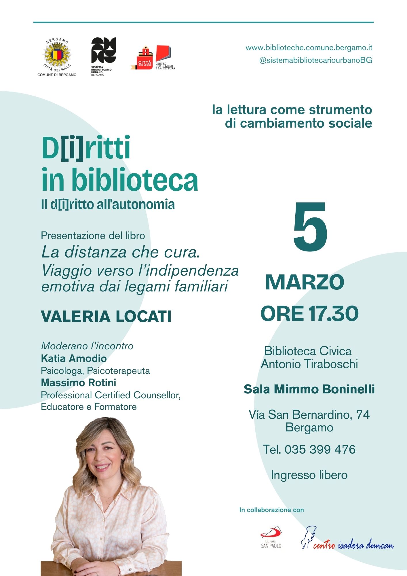 Per il ciclo di incontri «D[i]ritti in biblioteca» alla Biblioteca Tiraboschi di Bergamo, è in programma la presentazione del libro della psicoterapeuta Valeria Locati sull'indipendenza emotiva dai genitori.