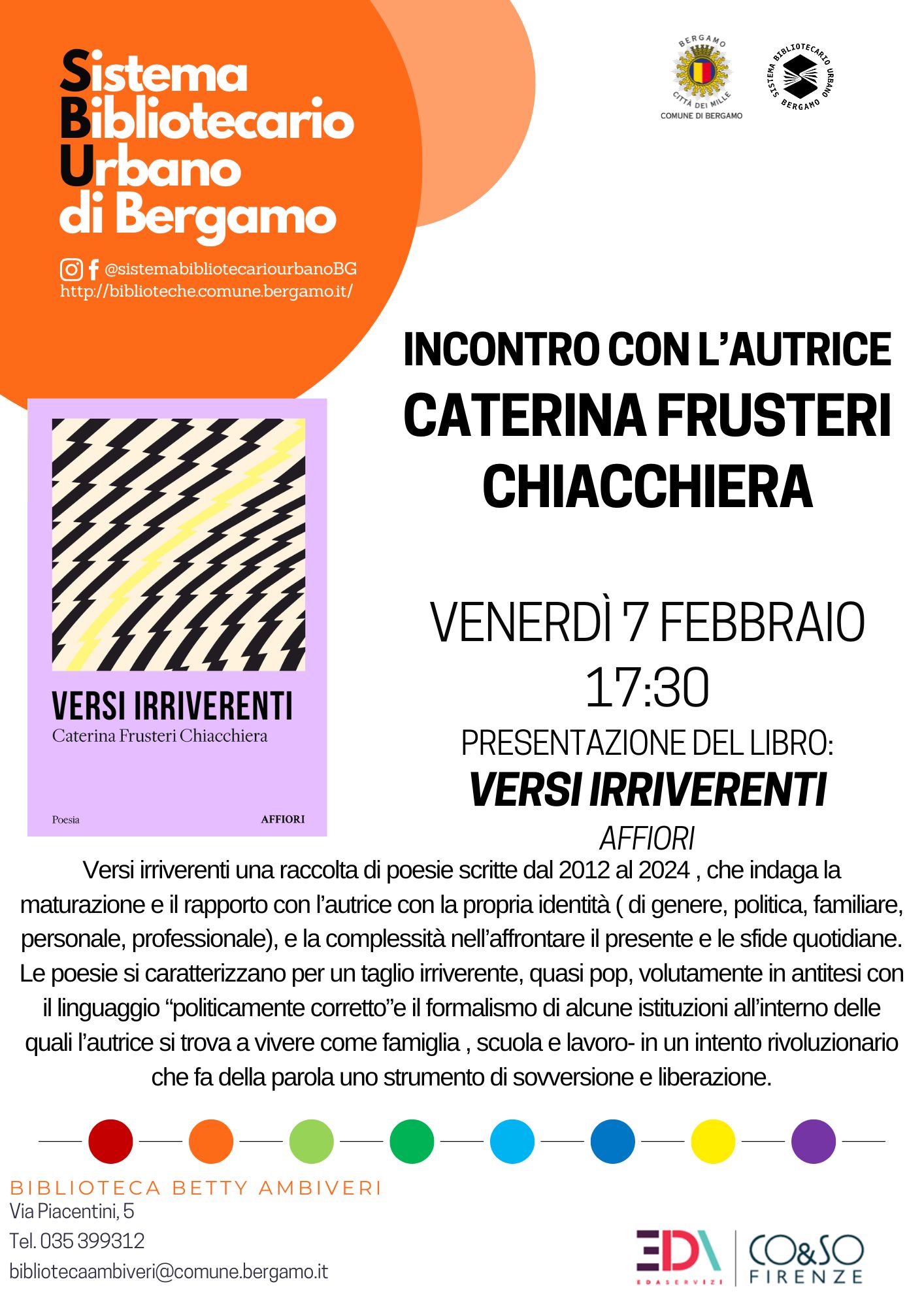 "Versi irriverenti" è una raccolta di poesie scritte dal 2012 al 2024 che indaga la maturazione e il rapporto con l’autrice con la propria identità. Incontro con l'autrice Caterina Frusteri Chiacchiera.