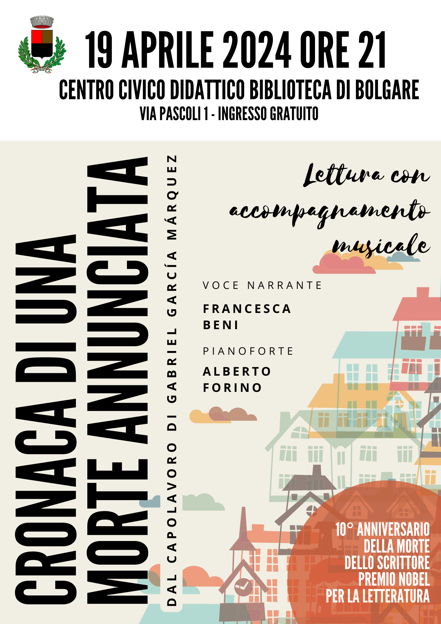 Lettura con accompagnamento musicale, tratta dall’omonimo romanzo di Gabriel García Márquez, con Francesca Beni (voce narrante) e Nicola Previtali (pianoforte).