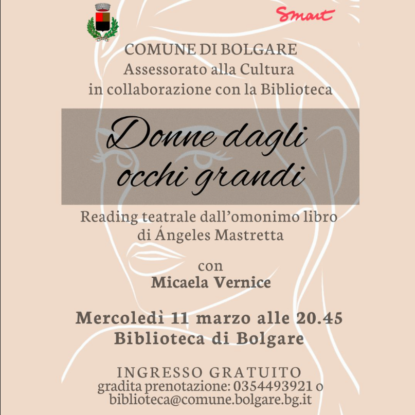 Mercoledì 11 marzo alle 20:45, presso la Biblioteca di Bolgare, si terrà il reading teatrale «Donne dagli occhi grandi», tratto dall’omonimo libro della scrittrice Ángeles Mastretta.