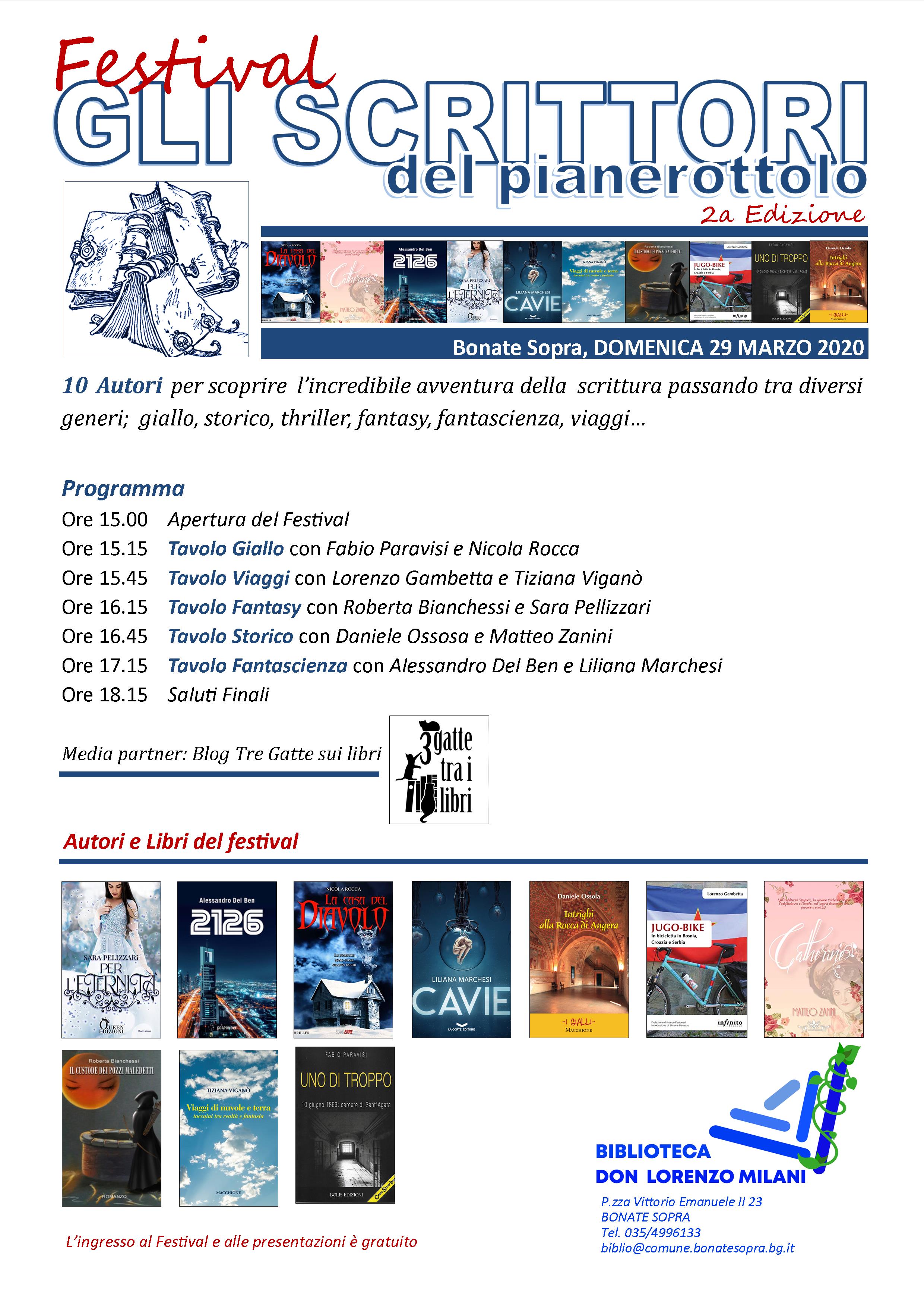 La biblioteca comunale “don Lorenzo Milani” di Bonate Sopra organizza la seconda edizione del Festival “Gli scrittori del pianerottolo” dedicato ad autori emergenti.