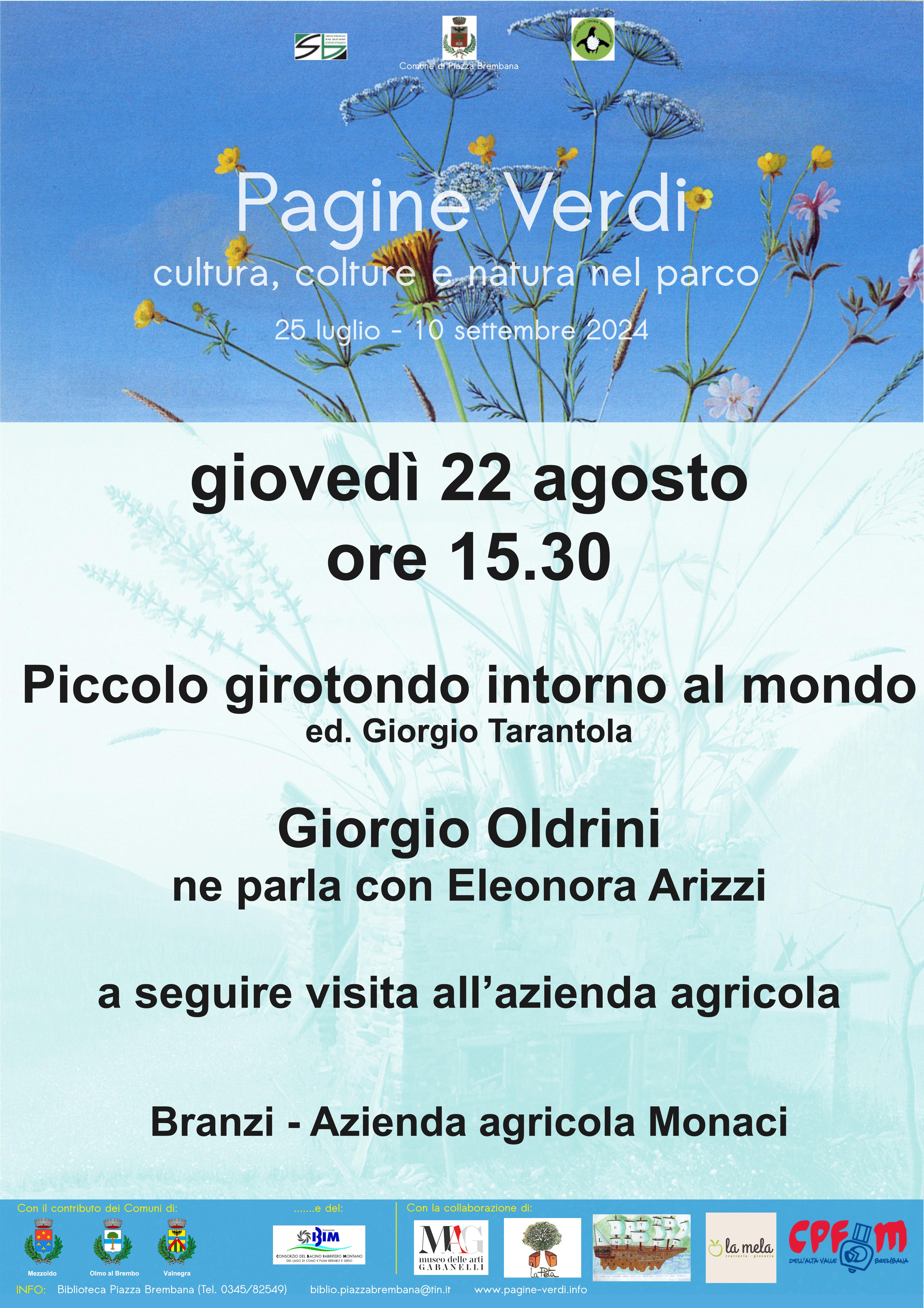 Sesto incontro della rassegna Pagine verdi. Giorgio Oldrini parlerà con Eleonora Arizzi di Piccolo girotondo intorno al mondo pubblicato quest'anno. Seguirà la visita all'azienda Monaci.