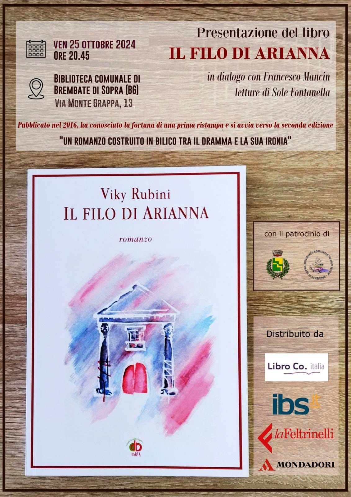 Il romanzo "Il filo di Arianna", di Vicky Rubini, musicista e giovane medico, viene presentato venerdì 25 ottobre alle 20,45 presso la biblioteca comunale di Brembate di Sopra.