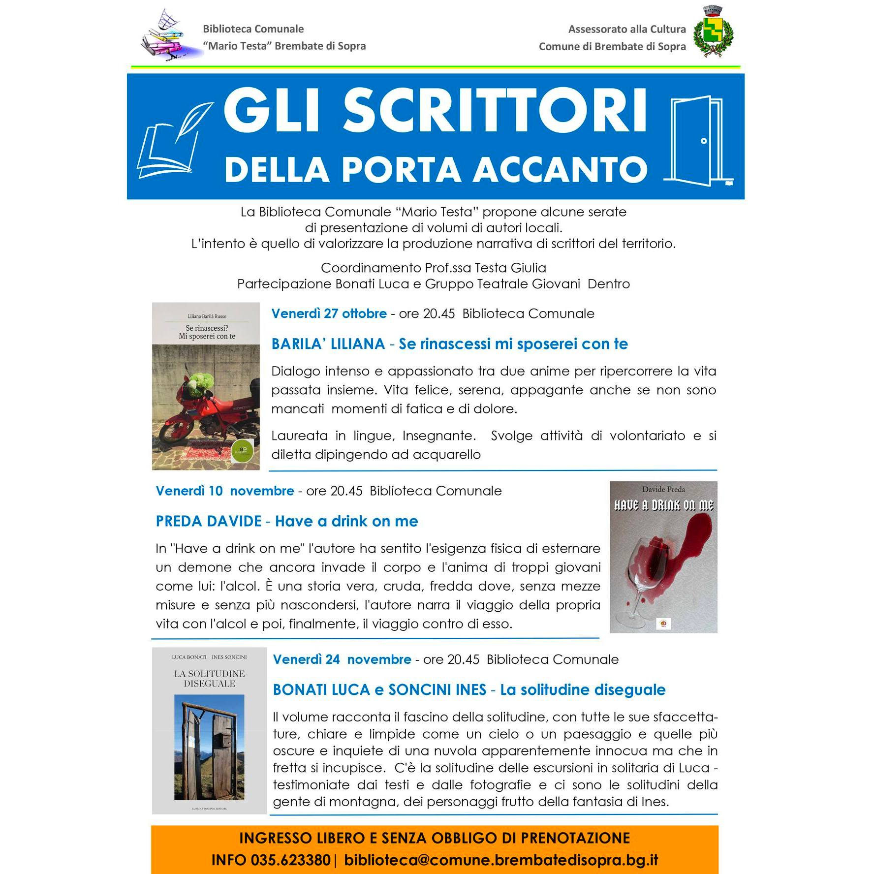 La Biblioteca Comunale "Mario Testa" di Brembate Sopra propone per la rassegna "Gli scrittori della porta accanto", tre serate di presentazione di volumi di autori locali con l'intento di valorizzare la produzione narrativa di scrittori del territorio..