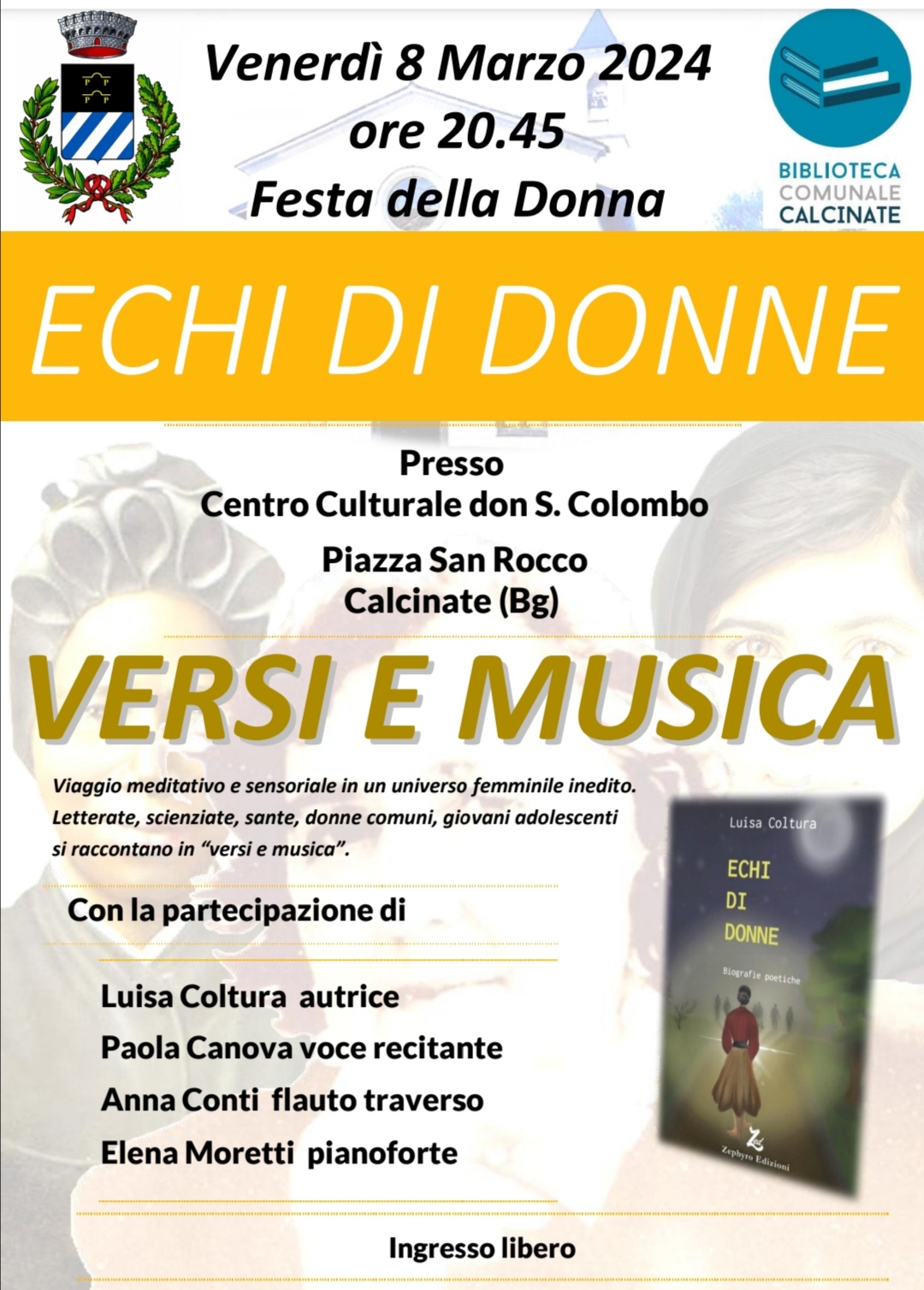 In occasione della Giornata Internazionale della Donna la Biblioteca di Calcinate organizza un evento poetico musicale durante il quale verranno letti dall'attrice Paola Canova alcuni monologhi tratti dal libro di Luisa Coltura "Echi di donne. Biografie poetiche". I monologhi saranno accompagnati dalle musiche della flautista Anna Conti e della pianista Elena Moretti.