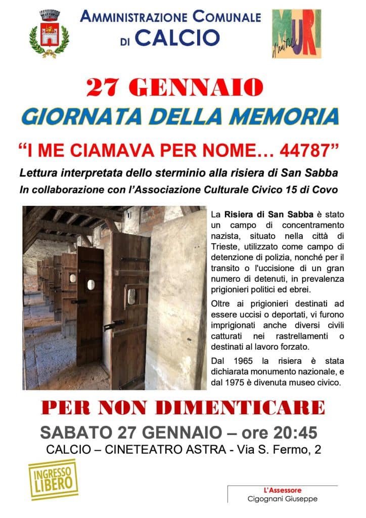 In occasione della Giornata della memoria, il Comune di Calcio presenta โI me ciamava per nomeโฆ 44787โ, lettura interpretata dello sterminio alla risiera di San Sabba.