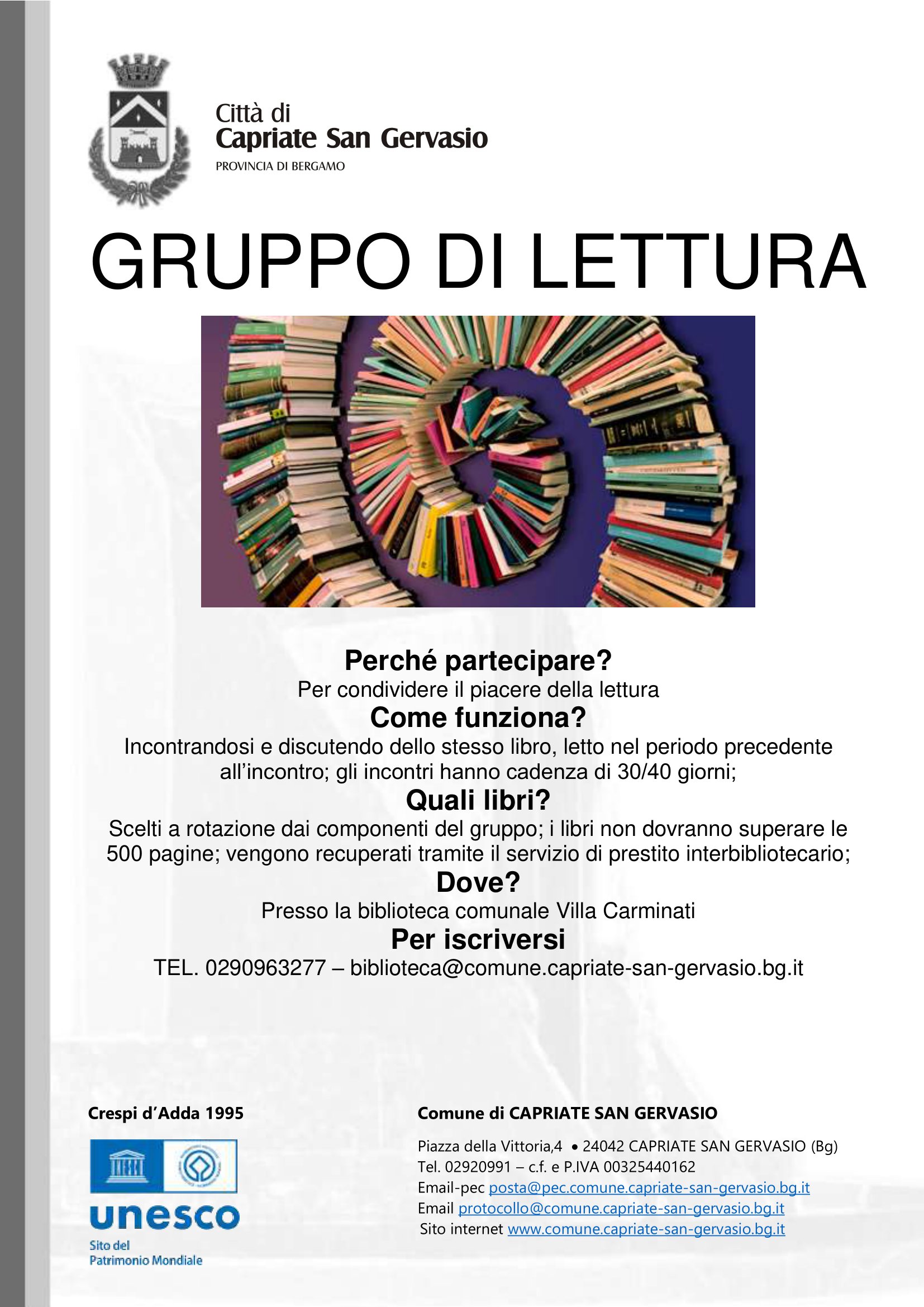 I libri verranno scelti a rotazione dai componenti dal gruppo, hanno un limite di 500 pagine e vengono recuperati tramite il servizio di prestito interbibliotecario.