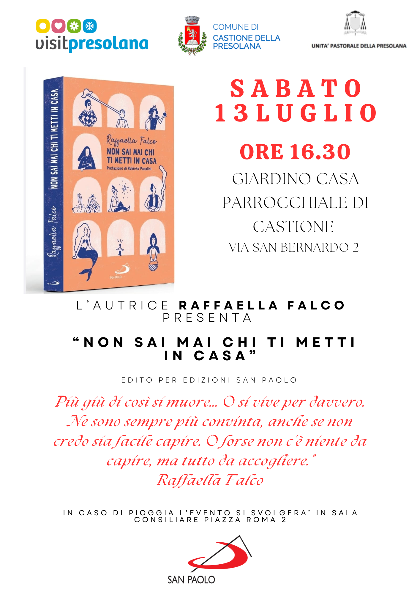 Sabato 13 luglio presso il giardino della casa parrocchiale di Castione è in programma l'incontro con l'autrice Raffaella Falco che presenterà la sua nuova uscita “Non sai mai chi ti metti in casa”.