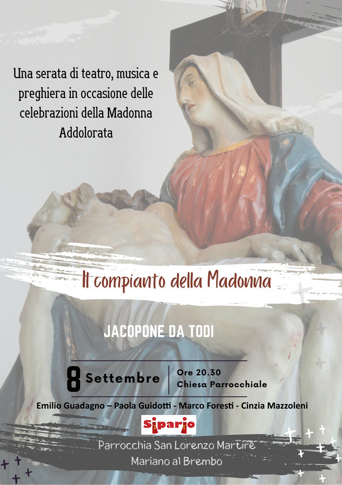 “Il pianto della Madonna”, lauda anche detta “Donna de Paradiso” dal primo verso pronunciato da Giovanni rivolgendosi a Maria, di Jacopone da Todi è l'esempio più famoso di lauda drammatica, nonché in assoluto la prima (XIII secolo), costruita interamente sotto forma di un concitato dialogo tra san Giovanni Evangelista, Gesù, la Madonna e la folla durante gli ultimi momenti della vita di Cristo. La messa in scena prevede l’aggiunta di una parte iniziale tratta da “Gesù. Un racconto sempre nuovo” di Davide Rondoni che contestualizza magistralmente la lauda finale partendo dall’orto degli ulivi a Pilato sino al Calvario.