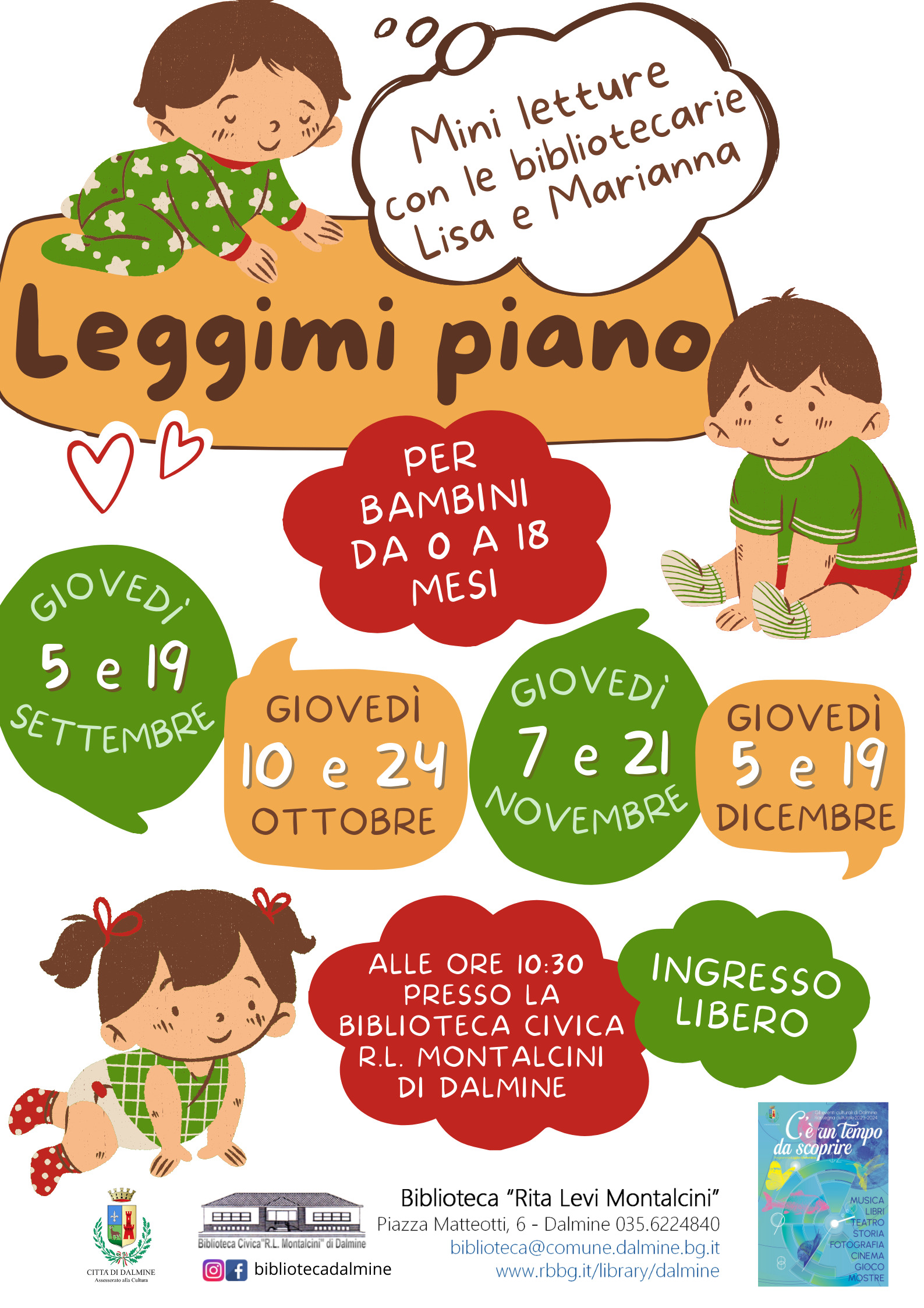 Prosegue la rassegna culturale "C'è un tempo da scoprire" della città di Dalmine con il ciclo di eventi per bambini da zero a diciotto mesi "Leggimi piano": appuntamento con mini letture a cura delle bibliotecarie.