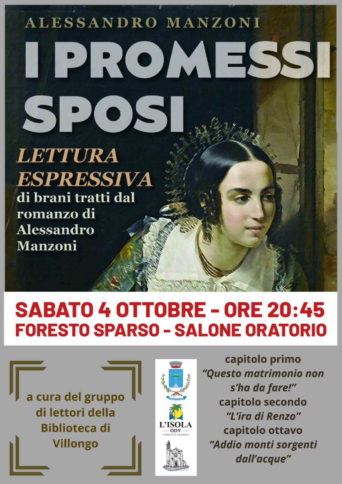 Sabato 4 ottobre, alle 20,45, presso il salone dell'oratorio di Foresto Sparso, si terrà la lettura espressiva "I Promessi Sposi" a cura del gruppo di lettori della Biblioteca di Villongo.