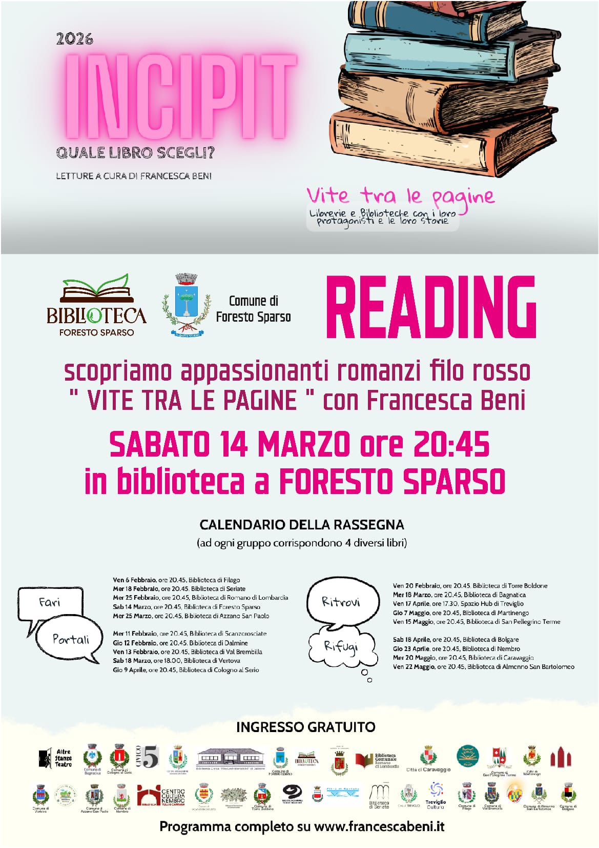 Nell'ambito della rassegna «Incipit. Quale libro scegli?», sabato 14 marzo, alle 20:45, si terrà una lettura a cura di Francesca Beni, presso la Biblioteca di Foresto Sparso.