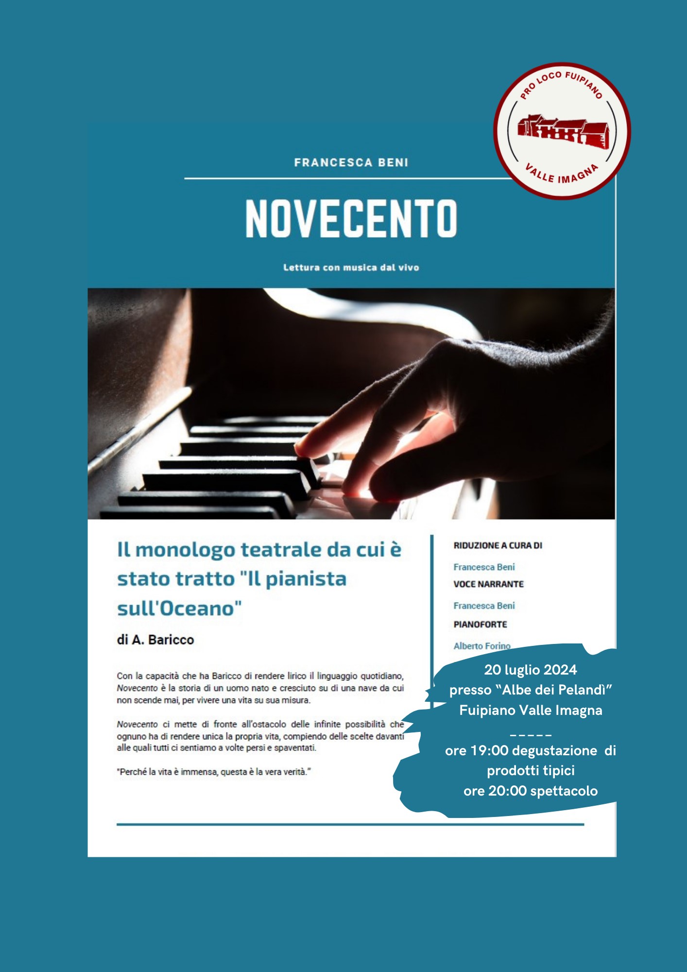 La rassegna "Estate insieme a Fuipiano 2024" prosegue. In questa giornata ci sarà una lettura dal vivo del capolavoro "Novecento ", con voce narrante di Beni Francesca. Il tutto sarà accompagnato da svariate note musicali.