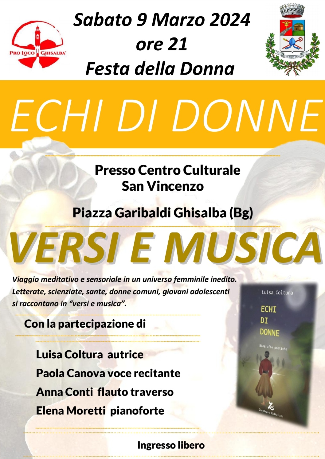 In occasione della Giornata Internazionale della Donna la Pro Loco di Ghisalba organizza un evento poetico musicale durante il quale verranno letti dall'attrice Paola Canova alcuni monologhi tratti dal libro di Luisa Coltura "Echi di donne. Biografie poetiche".
