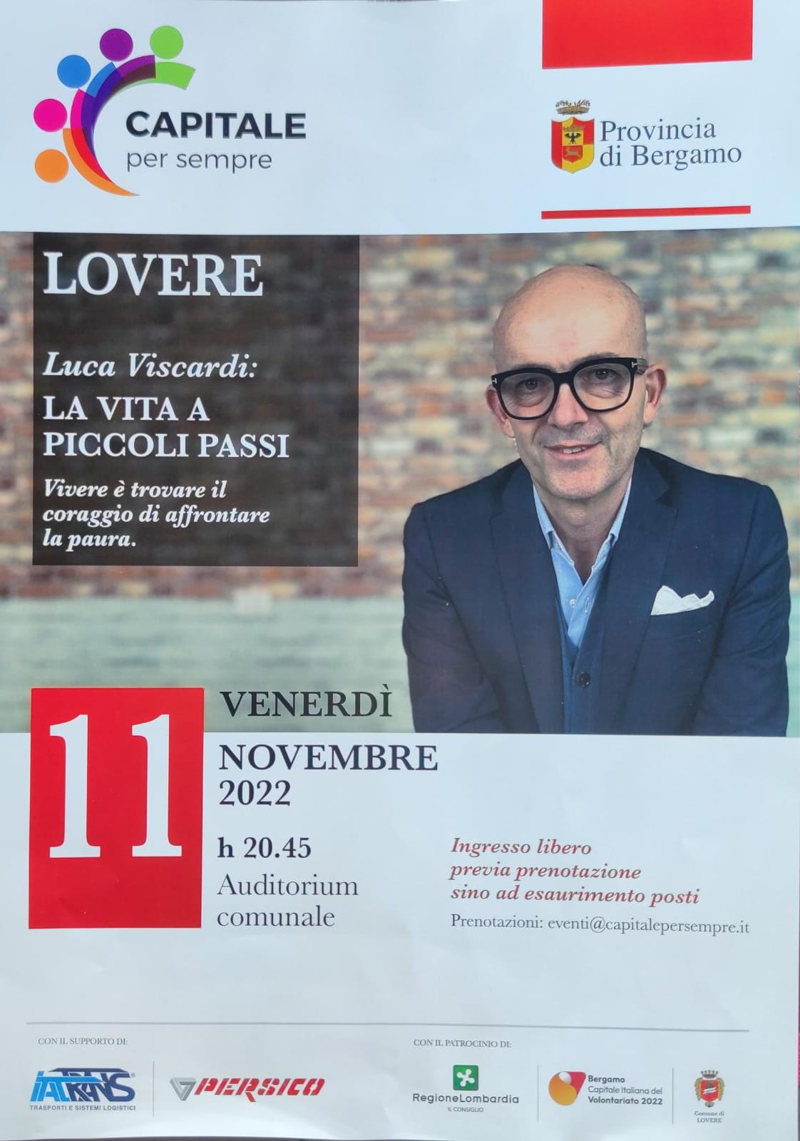 Nell'ambito del progetto โCapitale per sempreโ, a Lovere si terrร la presentazione del libro โLa vita a piccoli passi. Vivere รจ trovare il coraggio di affrontare la pauraโ di Luca Viscardi.