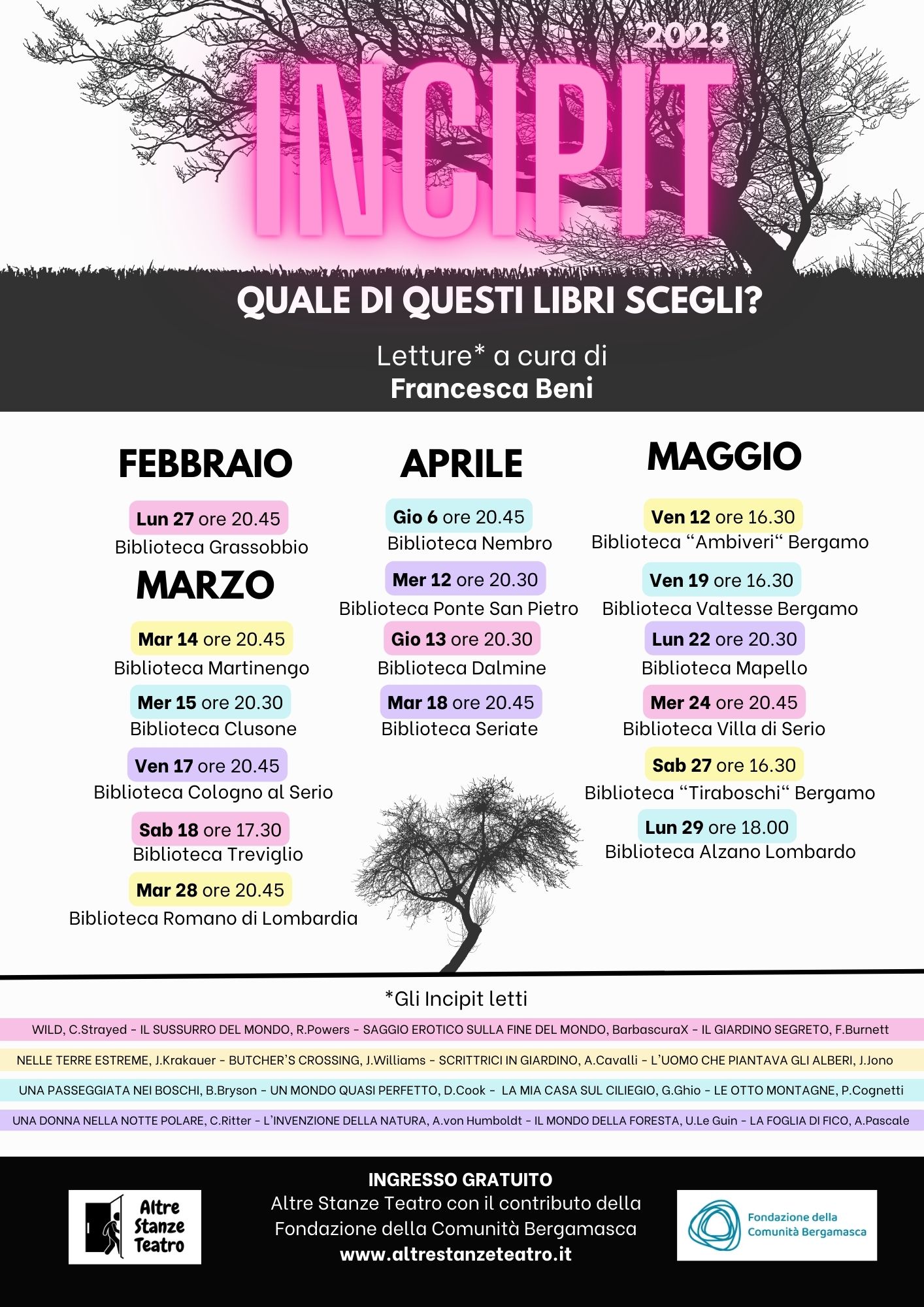 Nella rassegna "Incipit - Quale di questi libri scegli??", un'attrice legge le prime pagine di quattro libri. Tra un libro e l'altro, il pubblico scrive su di un foglietto la parola che associa al brano appena ascoltato e lo attacca ad una lavagna. A fine incontro, tutti quei foglietti raccontano il viaggio degli spettatori attraverso le parole dei libri e sono l'occasione per confrontarsi sulla magia della lettura.
