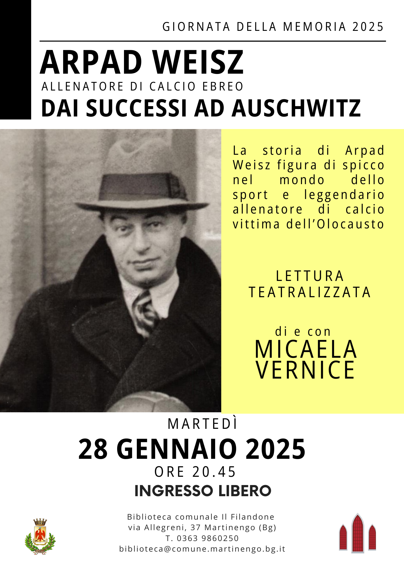 In occasione della Giornata della Memoria 2025 la biblioteca propone la lettura teatralizzata che racconta la storia di Arpad Weisz, allenatore di calcio ebreo, a partire dai successi al tragico passaggio da Auschwitz.