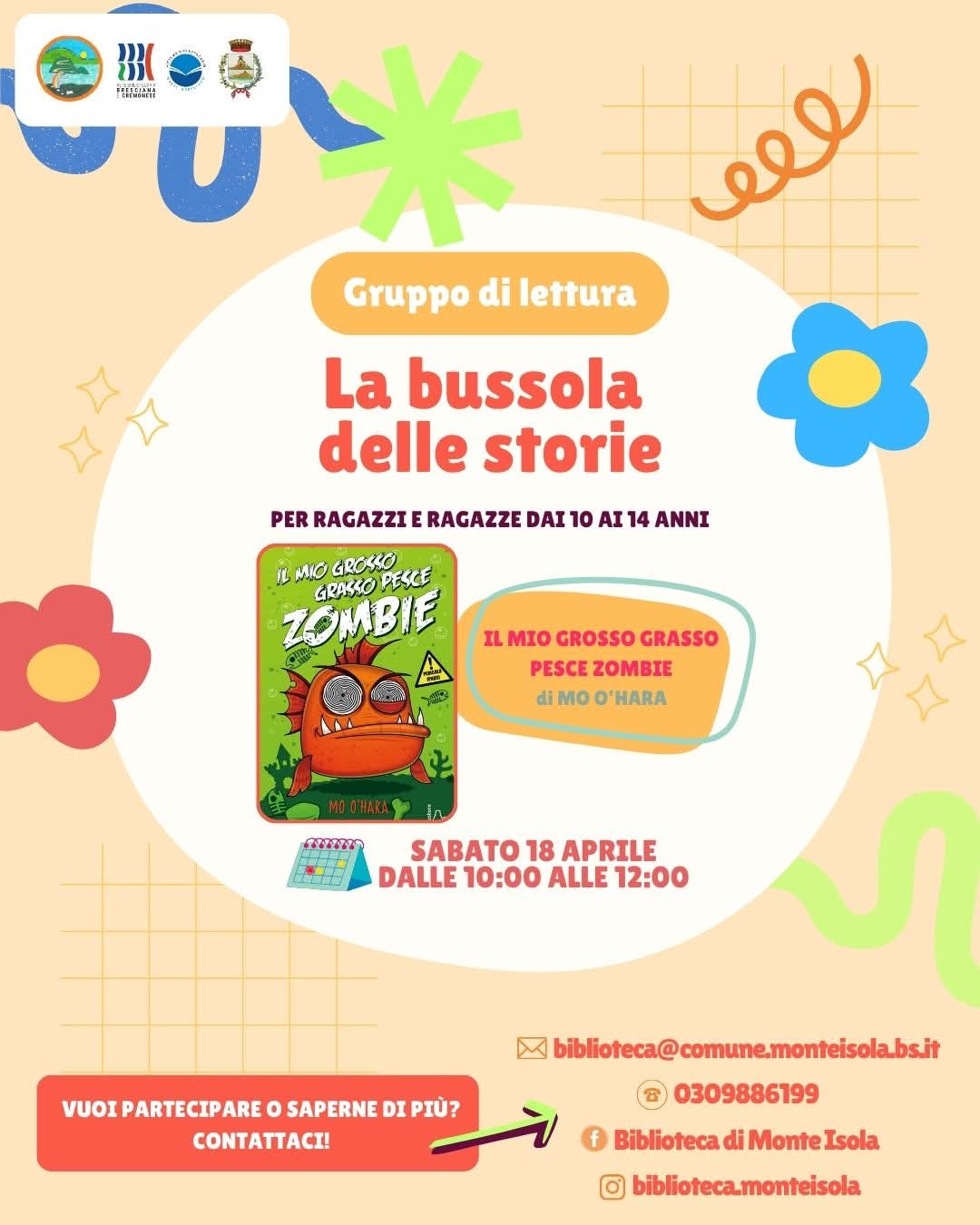 Sabato 18 aprile, dalle 10 alle 12, presso la Biblioteca di Monte Isola si terrร un incontro del gruppo di lettura ยซLa Bussola di Storieยป, dove si leggerร il libro ยซIl mio grosso grasso pesce zombieยป di Mo O'Hara.